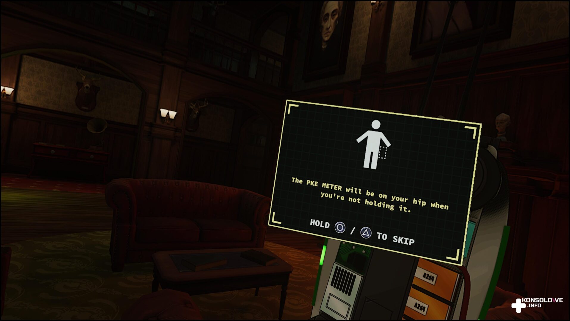 W recenzowanej produkcji wiele godzin spędzimy oczywiście na łapaniu duchów. Warto wobec tego przybliżyć nieco rozgrywkę. Same typy zadań opiszę w następnej części niniejszego artykułu. Teraz natomiast przejdę do przedstawienia dostępnych dla nas urządzeń i sposobów ich używania. Mamy na podorędziu trzy sprzęty. Pierwszym z nich jest przenośny skaner PKE. Jest ono domyślnie przyczepione do naszego prawego biodra. Po sięgnięciu po PKE, możemy wyciągnąć dzierżącą go dłoń przed siebie, by korzystać z radaru pokazującego najbliższe wahania obecności duchów. Dobrze, że widoczna jest strzałka informująca nas, czy szukany obiekt lub duch są wyżej czy niżej. Im bliżej jesteśmy, tym bardziej rozsuwają się ramiona urządzenia, a efekty dotykowe kontrolera Sense przybierają na sile. Proste i sensowne.