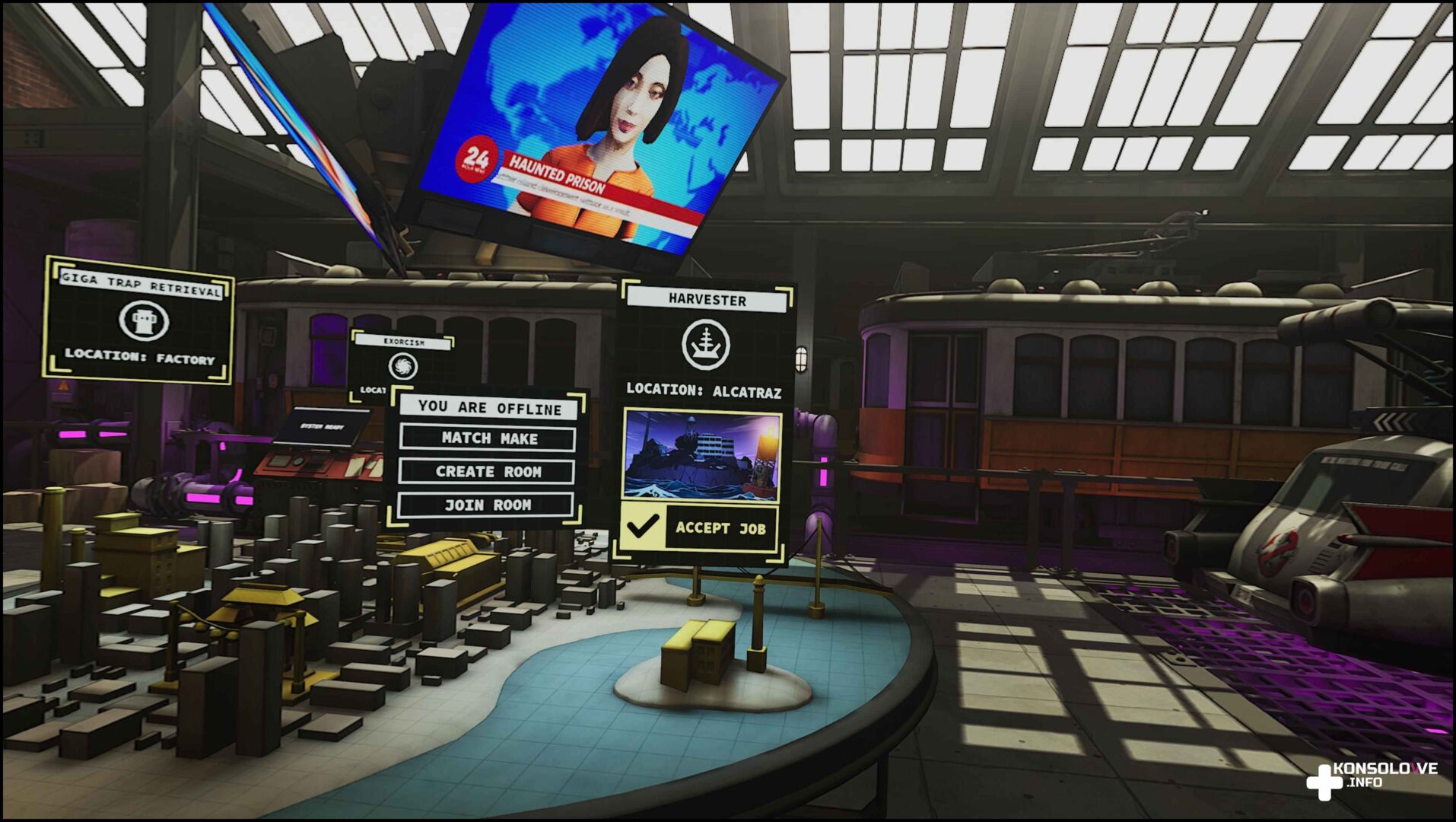 W centrum dowodzenia znajdziemy też szafę, która pozwoli nam zakładać alternatywne stroje dla każdej z postaci, w jakie możemy się wcielić. Wpływa to wyłącznie na kwestie kosmetyczne – nie ma tu poziomów postaci ani gracza i ulepszenia dotyczą wyłącznie sprzętu. Nawet jeżeli nie zależy Wam na wyglądzie bohatera, to warto pokręcić się po centrum dowodzenia. W innym komputerze możemy przejrzeć informacje na temat duchów, na jakie się natknęliśmy. Z kolei nieopodal samochodu znajdziemy inny komputer, informujący nas o liczbie znalezionych oraz wszystkich duchów, jak również dostępnych zadaniach składających się na podstawową kampanię. Liczy ona nieco ponad 40 zleceń, a jedno trwa około 10 minut. Jest to więc idealna gra zarówno na dłuższe, jak i krótsze sesje z goglami. W centralnym punkcie naszej bazy znajdziemy mapę, na której widzimy dostępne zadania oraz potwierdzamy wybór zlecenia. Więcej na temat typów misji pisałem oczywiście wcześniej.
