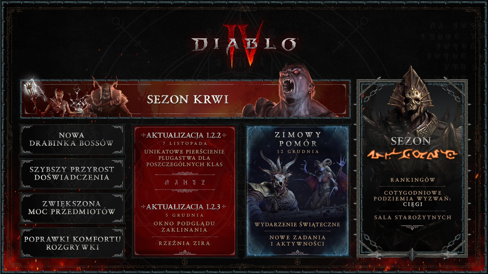 Od przyszłego tygodnia do gry trafi 5 unikatowych pierścieni dla poszczególnych klas, które pozwolą skorzystać nam z mocy znanych z Sezonu Plugawców. Następnie, 5 grudnia, w Diablo IV pojawi się podgląd zaklinania u okultystów. Dzięki niemu gracze będą mogli sprawdzić, jakie afiksy mogą zyskać, zanim wydadzą ciężko zarobione złoto. To kolejny sposób, by dać nam większą kontrolę nad tworzeniem konfiguracji, która pozwoli sprostać dowolnym wyzwaniom. Również 5 grudnia Bizzard wprowadzi Rzeźnię Zira – sześciotygodniowe wydarzenie końcowej fazy gry, które można wielokrotnie powtarzać. Mogą w nim brać udział gracze, którzy osiągnęli poziom 100, zabili Uber Duriela i osiągnęli mistrzostwo we wszystkich innych wyzwaniach