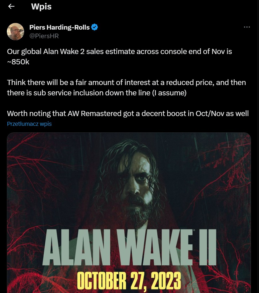 Jak wynika ze wpisu zamieszczonego w serwisie X, najnowsze dzieło Finów sprzedało się na samych konsolach w około 850,000 kopii. Biorąc pod uwagę fakt, że nowe losy tytułowego pisarza miały premierę 27 października, jest to bez wątpienia świetny wynik. Niżej znajdziecie oryginalny wpis informujący o tym sukcesie.