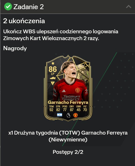 Następnie udajcie się do zakładki z zadaniami, w segmencie „na żywo” szukajcie wyzwania o nazwie „Skrupulatność ulepszenia codziennego logowania ZKW„. W kroku drugim czeka na was darmowa karta TOTW Garnacho 86. Gdy karta wyszła, kosztowała ponad 100k monet, teraz cena się już unormowała do innych kart TOTW. Warto też zajrzeć do innych wyzwań. Z pewnością do zdobycia dzisiaj i w kolejnych dniach będzie sporo darmowych paczek z kartami w kilku krokach.