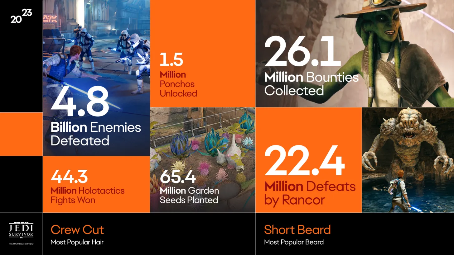 Gracze Star Wars Jedi: Survivor wybrali głównie fryzurę Crew Cut, 22,4 miliona graczy zostało pokonanych przez Rancora, zasadzono 65,4 miliona nasion ogrodowych i odblokowano 1,5 miliona poncza.