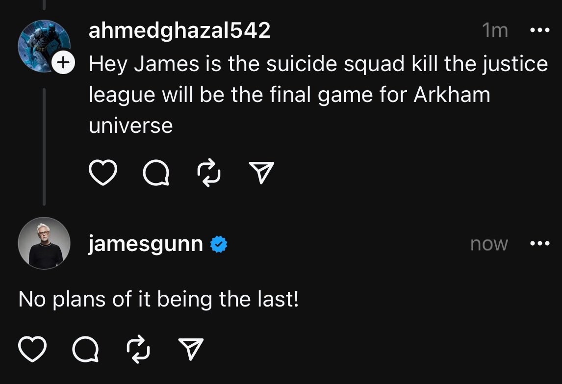 Co więcej, jak informuje serwis VG247, Legion Samobójców: Śmierć Lidze Sprawiedliwości bynajmniej nie będzie ostatnią grą z tak zwanego Arkhamverse. Wskazuje na to poniższa odpowiedź Jamesa Gunna, która w chwili publikowania tego newsa jest już jednak usunięta.