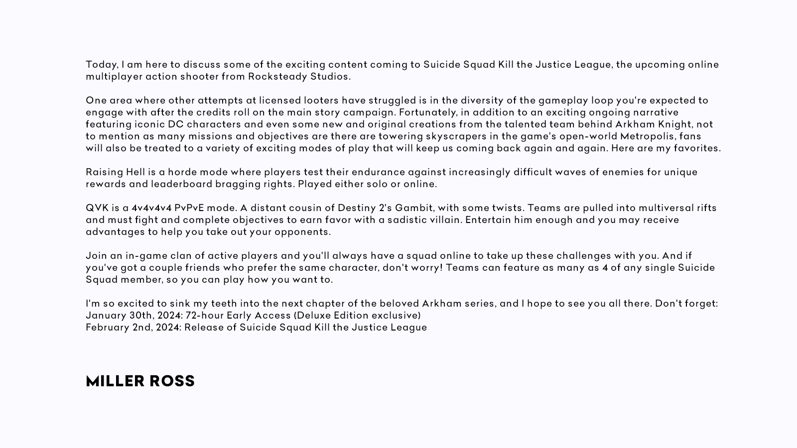 Miller Ross wspomniał również o klanach aktywnych graczy. Dzięki nim mielibyśmy zawsze mieć możliwość dołączenia do drużyny, która chciałaby wykonywać zadania w sieciowym trybie współpracy. Co istotne, nie ma być przeszkód we wcielaniu się w dowolnego członka Legionu. Moglibyśmy więc zawsze grać jako nasza preferowana postać – nawet jeśli znajduje się ona już w składzie Team Force X. Niżej możecie przeczytać oryginalny wpis Rossa.