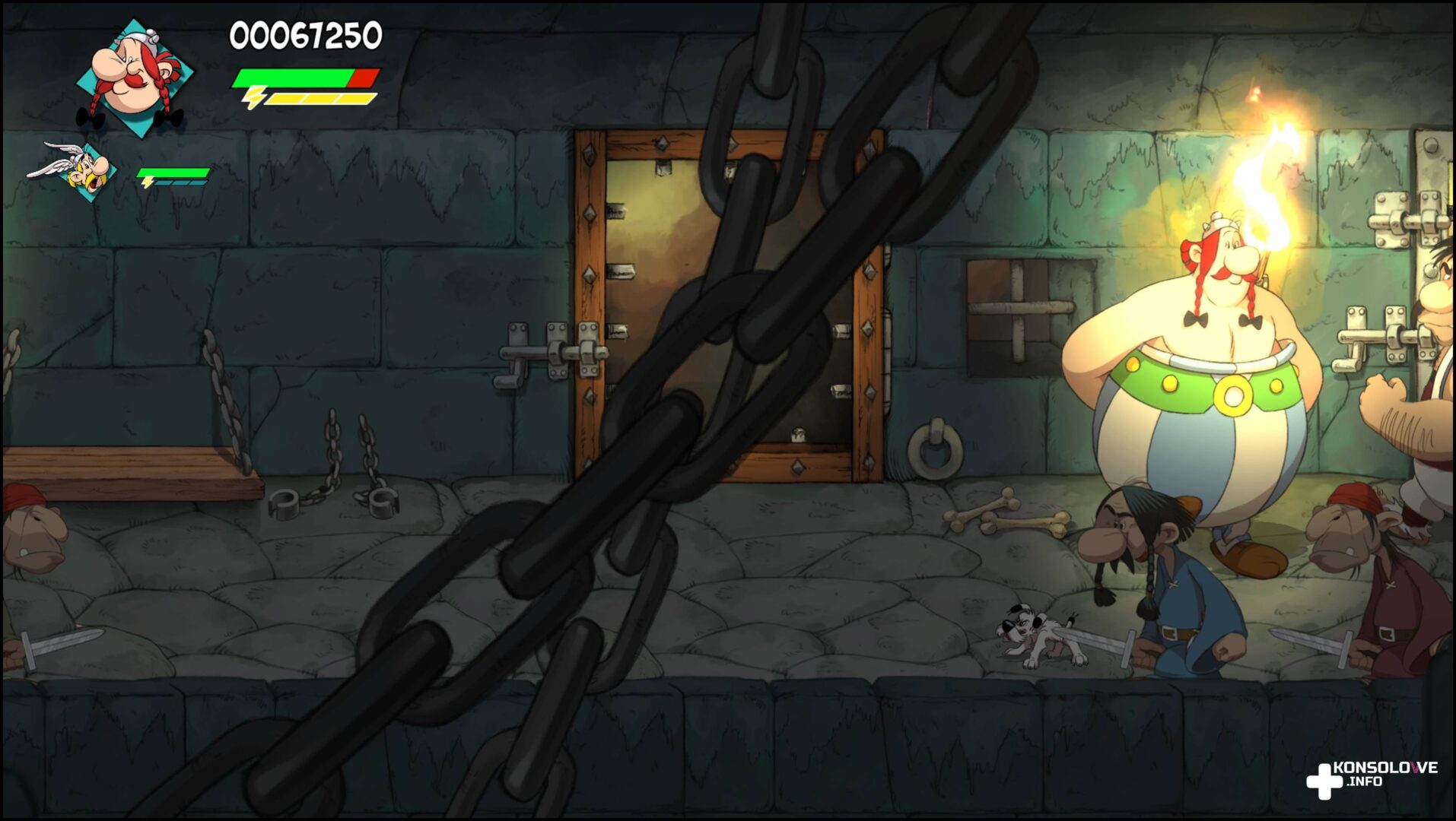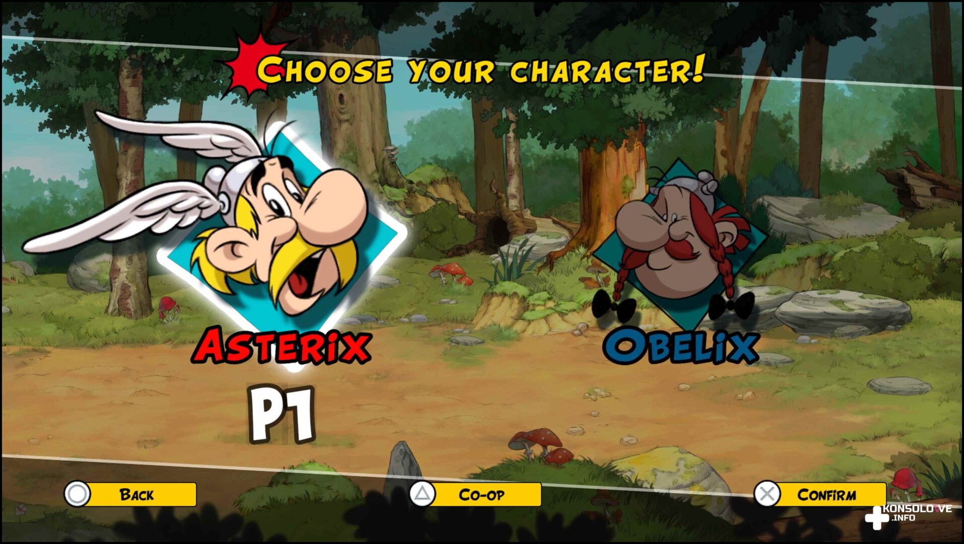 Wtedy oczywiście jeden gracz kontroluje Asterixa, a drugi Obelixa. Niestety, różnice między nimi są bardzo niewielkie. Każdy z Galów może używać szybkiego ciosu, ładowanego, specjalnego (dla mniejszego z przyjaciół jest to wirownie i atakowanie przeciwników, natomiast dla rudowąsego spadające z ziemi menhiry). Ponadto zarówno Asterix, jak i Obelix mogą chwycić przeciwnika i rzucać nim. Jednak to Obelix ma kolejne opcje po chwyceniu przeciwnika. Potrafi on bowiem uderzać oponentem na prawo i lewo, a nawet uderzać go w twarz (jak w pamiętnej scenie z „Uczebe” 😉 ).