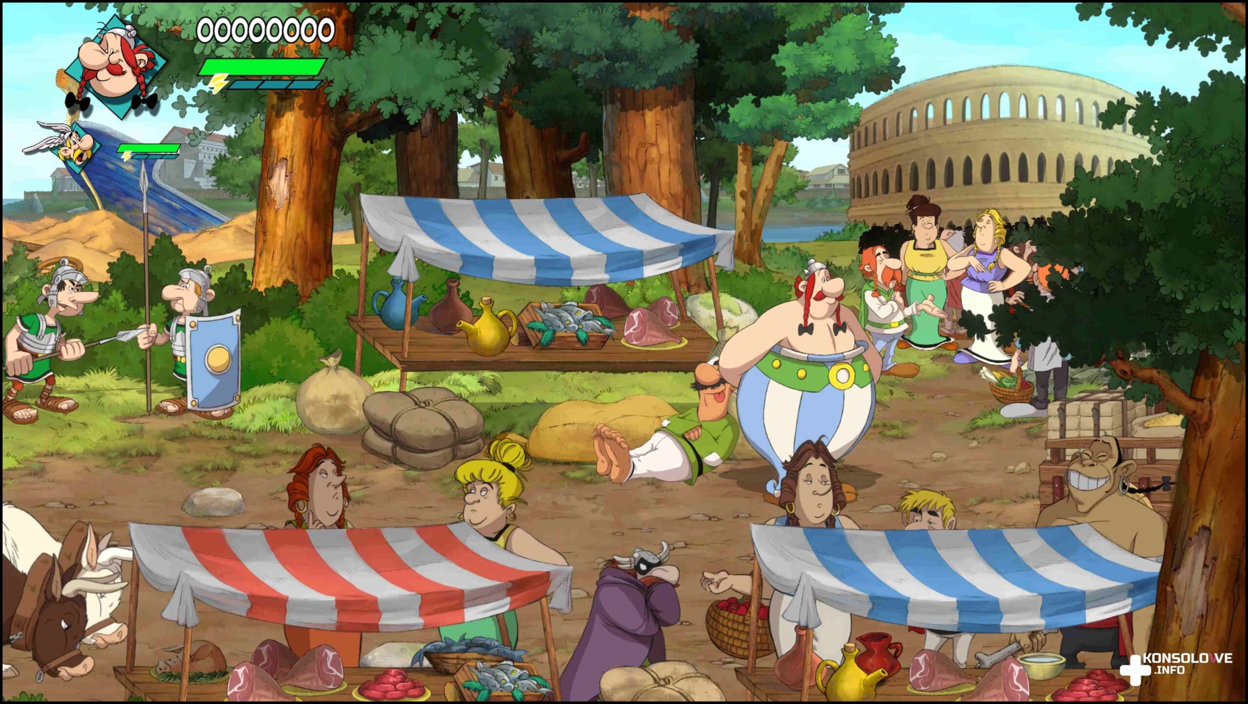 Wtedy oczywiście jeden gracz kontroluje Asterixa, a drugi Obelixa. Niestety, różnice między nimi są bardzo niewielkie. Każdy z Galów może używać szybkiego ciosu, ładowanego, specjalnego (dla mniejszego z przyjaciół jest to wirownie i atakowanie przeciwników, natomiast dla rudowąsego spadające z ziemi menhiry). Ponadto zarówno Asterix, jak i Obelix mogą chwycić przeciwnika i rzucać nim. Jednak to Obelix ma kolejne opcje po chwyceniu przeciwnika. Potrafi on bowiem uderzać oponentem na prawo i lewo, a nawet uderzać go w twarz (jak w pamiętnej scenie z „Uczebe” 😉 ).