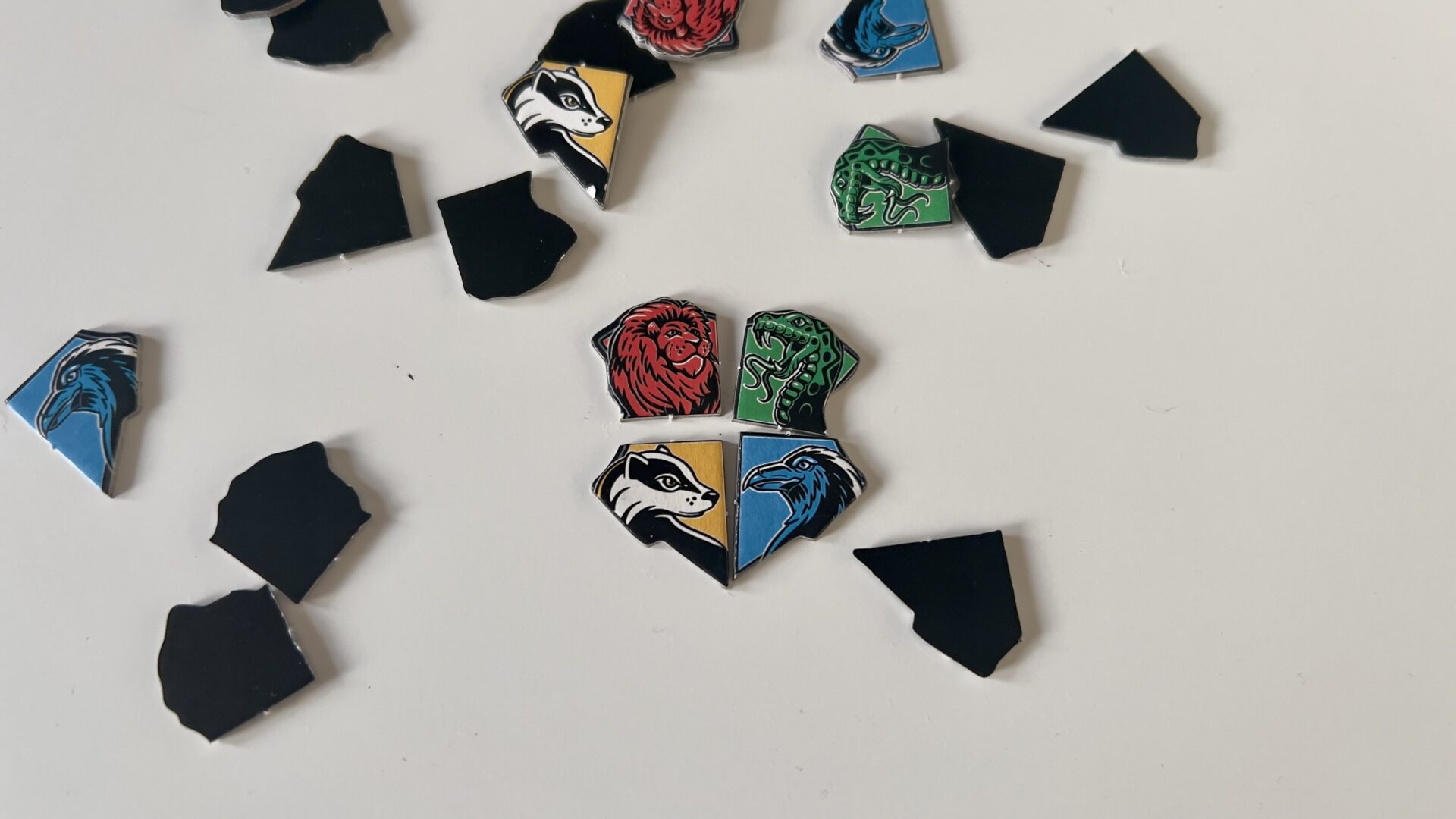 Gracze zasiadają przy stole i tasują dokładnie talię 80 kart zagadek (warto zrobić to dokładnie, by te same typy zagadek zbytnio się nie powtarzały). Następnie kładą ją na środku stołu. W zasięgu graczy układamy także wszystkie cząstki herbów Hogwartu, które pełnią rolę punktacji.