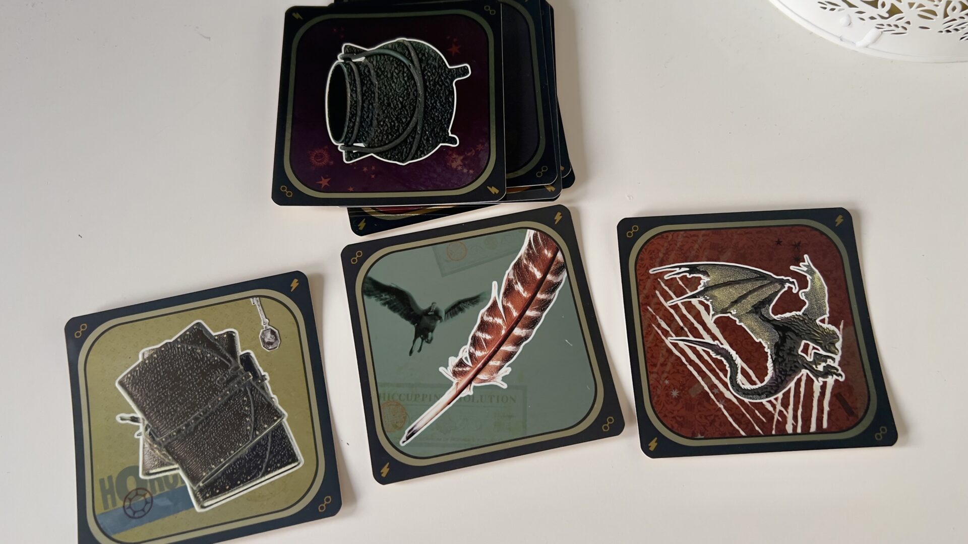 Większość z kart dostępnych w grze podzielonych jest na 8 różnych kategorii, z których każda przedstawia inny rodzaj zagadki (opiszę je w dalszej części tekstu). 10 z kart jest unikatowych, są to karty faktur. Są one wypukłe i przedstawiają różne przedmioty ze świata Harry’ego Pottera.
