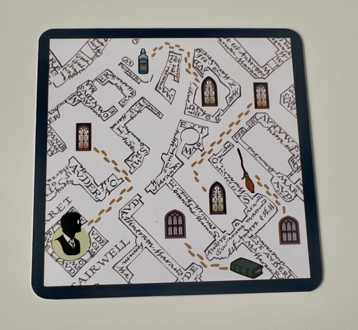 Na karcie zaznaczone są tajne przejścia pomiędzy komnatami Hogwartu. Podążaj za linią, by zaprowadzić Harry’ego do poszukiwanego przedmiotu. Na poniższym przykładzie jest to butelka z eliksirem.