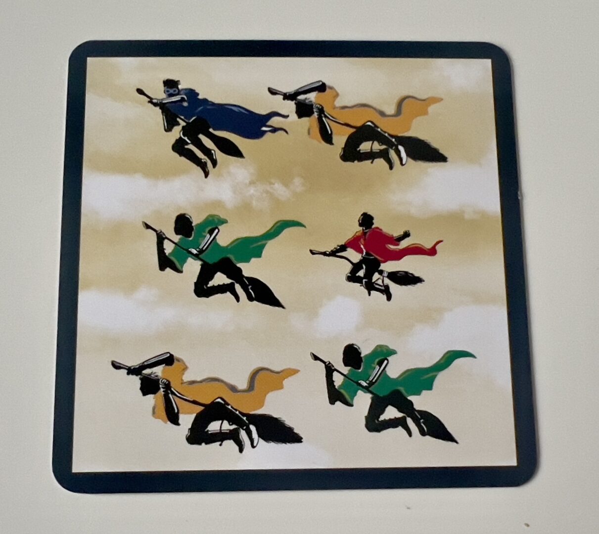 Na karcie przedstawiona jest kolejność, w jakiej ścigają się gracze na miotłach. Celem jest odgadnięcie, który z nich prowadzi. Na przykładzie jest to niebieski gracz.
