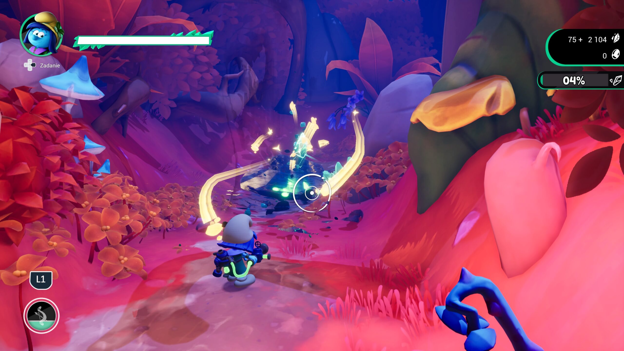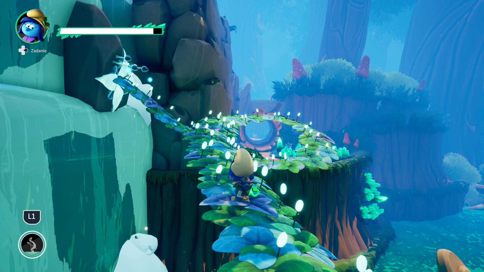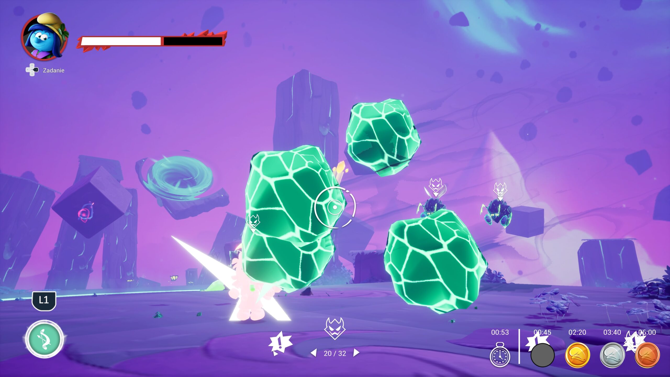 Fabuła w rozgrywce to nic innego jak motywator do dalszego działania i podejmowania kolejnych chwil z tytułem. W zależności od momentu w grze, w jakim się znajdujemy, zmieniamy Smerfa, którym się poruszamy. W tym momencie muszę przyznać, że Gradobitką grało mi się chyba najlepiej. Na swojej drodze spotykamy przeciwników, których możemy sprawnie pokonać i zbieramy odrobiny zielonych kryształów, dzięki którym ulepszamy umiejętności postaci oraz broni. Jeżeli ktoś dobrze skupi się na wątku głównym bez odnajdywania teleportów w kolorze czerwonym z dodatkowymi wyzwaniami, to w niecałe 5h można mieć już zabawę za sobą.