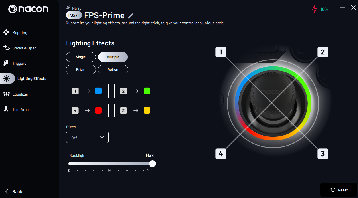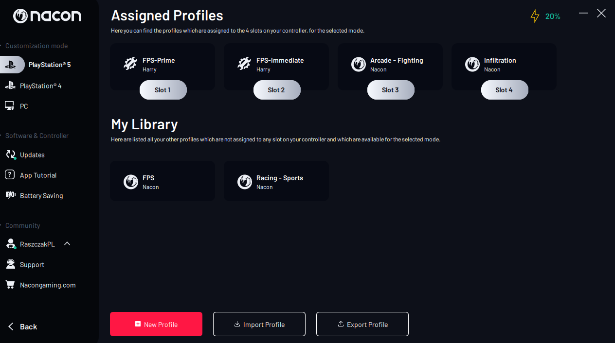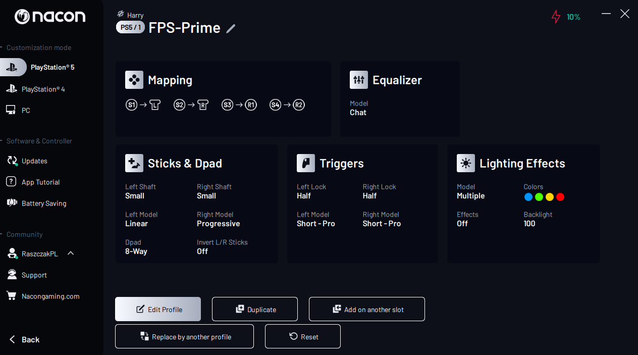 O ile mechaniczna konfiguracja joystickami, ciężarkami, D-padem itd. jest bardzo szybka, to takie prawdziwe ustawienie Nacon Revolution 5 PRO pod siebie już zajmuje trochę czasu. Na szczęście aplikacja jest naprawdę intuicyjna i bez problemu stworzycie w niej swoje profile. Można je również eksportować i zapisywać na dysku, ponieważ jednocześnie w kontrolerze może być ich maksymalnie 4. W profilach szczególnie ważne jest ustawienie zakresu pracy joysticków i spustów, ale nie zabrakło też mapowania przycisków oraz ledów. Niestety, podłączanie kontrolera między konsolą i komputerem zajmuje oczywiście czas, ale Nacon obiecuje, że pracuje nad dedykowaną aplikacją na komórki. Nie byłby to ich pierwszy tego typu program i nie ukrywam, że niecierpliwie na niego czekam.