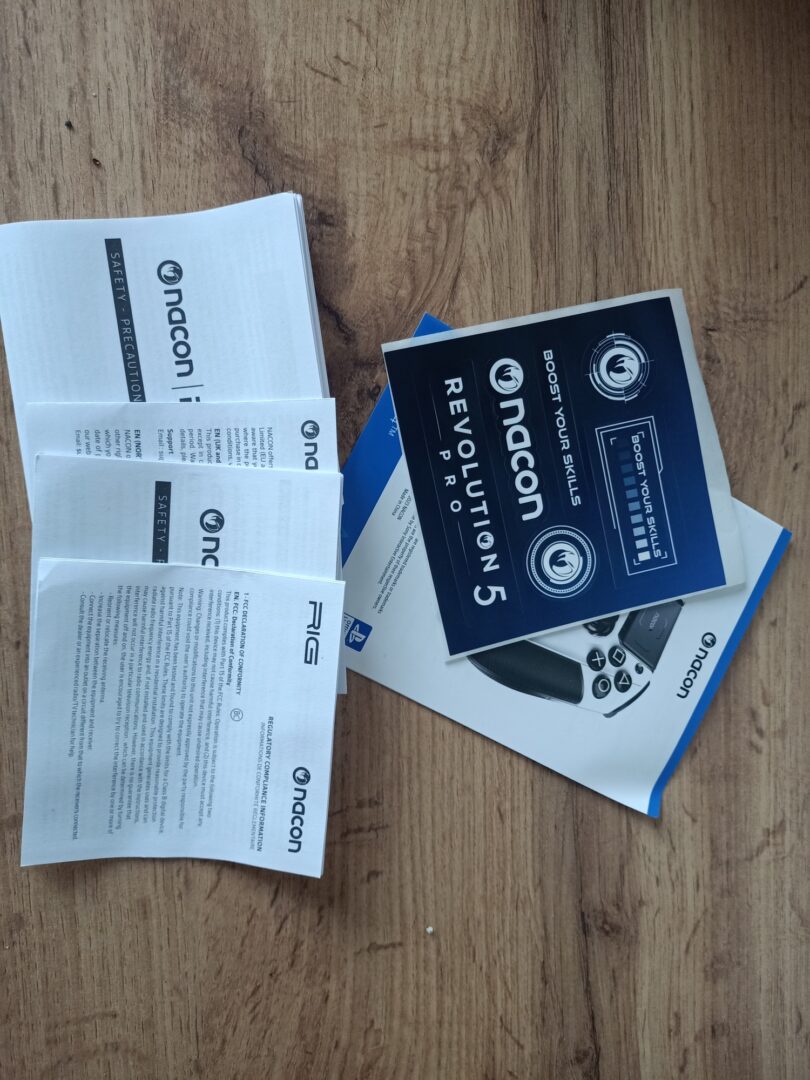 Oprócz tego w pokrowcu znalazło się miejsce na przechowywanie dongle’a oraz 3-metrowego kabla USB-A do USB-C. Oczywiście, żeby połączyć się bezprzewodowo z Nacon Revolution 5 PRO potrzebny jest wspomniany nadajnik USB. Co prawda nie wybudzicie swoim kontrolerem konsoli z uśpienia, ale przynajmniej menu główne informuje o stopniu jego naładowania. W opakowaniu było też parę papierków, ale naprawdę razi to, że nie znalazło się miejsce na instrukcję. Oczywiście, wszystko jest w internecie na oficjalnej stronie producenta (tutaj), ale mogło i powinno znaleźć się również w zestawie.
