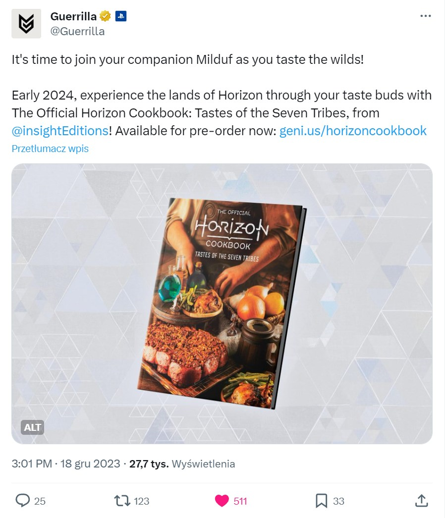 Nie ulega żadnej wątpliwości, że gamingowe książki kucharskie cieszą się coraz większą popularnością. Zauważyli to też deweloperzy ze studia Guerilla, którzy razem z wydawnictwem Insight Editions przygotowali The Official Horizon Cookbook. Książka zadebiutuje w kwietniu 2024 roku, zamówienia przedpremierowe znajdziecie m.in. na Amazonie. Sześćdziesiąt potraw inspirowanych grami Horizon, będzie dostępne oczywiście w angielskiej wersji językowej. Autorami książki są: Victoria Rosenthal i Rick Barba, którzy przygotowali razem w 2022 roku God of War: The Official Cookbook.