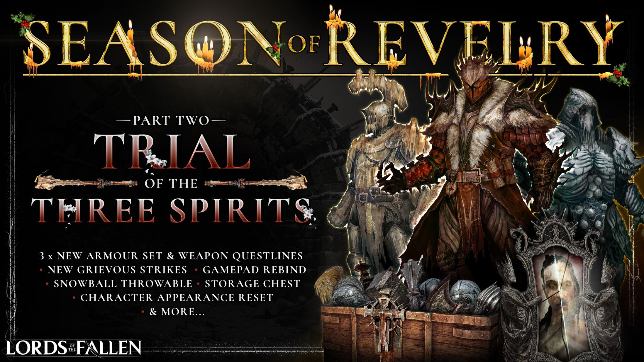 CI Games i studio HEXWORKS ogłaszają start eventu “Season of Revelry” w Lords of the Fallen. Jest to dwuczęściowe, z pewnością całkowicie bezpłatne wydarzenie świąteczne. Pierwsza część zatytułowana „Offerings of Orius” już dziś trafiła do graczy. Natomiast kolejna – „Trial of the Three Spirits” – zostanie udostępniona 21 grudnia. Obie aktualizacje wprowadzają też wiele nowości, w tym trzy kolejne zadania. Wykonanie ich nagrodzi graczy unikalnymi zestawami broni i pancerza. Ponadto spodziewajcie się nowych zaklęć, finiszerów, pocisków do ataków dystansowych oraz czegoś zupełnie wyjątkowego – bitwy na śnieżki.