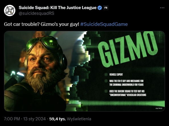 Nie ulega najmniejszej wątpliwości, że Legion Samobójców: Śmierć Lidze Sprawiedliwości to jedna z najbardziej wyczekiwanych przeze mnie produkcji odkąd należę do redakcji Konsolowe.info. Chyba tylko na Cyberpunk 2077 czekałem z równym zapałem. Na szczęście do premiery przygód Task Force X zostało zaledwie 15 dni. Studio Rocksteady bynajmniej nie przestaje promować swojego dzieła. W weekend w mediach społecznościowych pojawiły się grafiki krótko opisujące dwóch pomocników Legionu. Zacznijmy od Gizma.