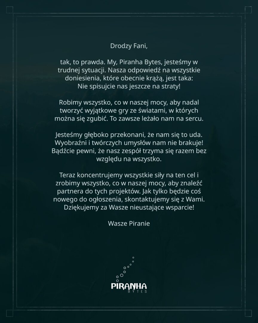 Piranha Bytes, studio stojące za Elex i Gothickiem, potwierdza ciężką sytuację. Uspokajają jednak fanów i mówią, że się nie poddają.