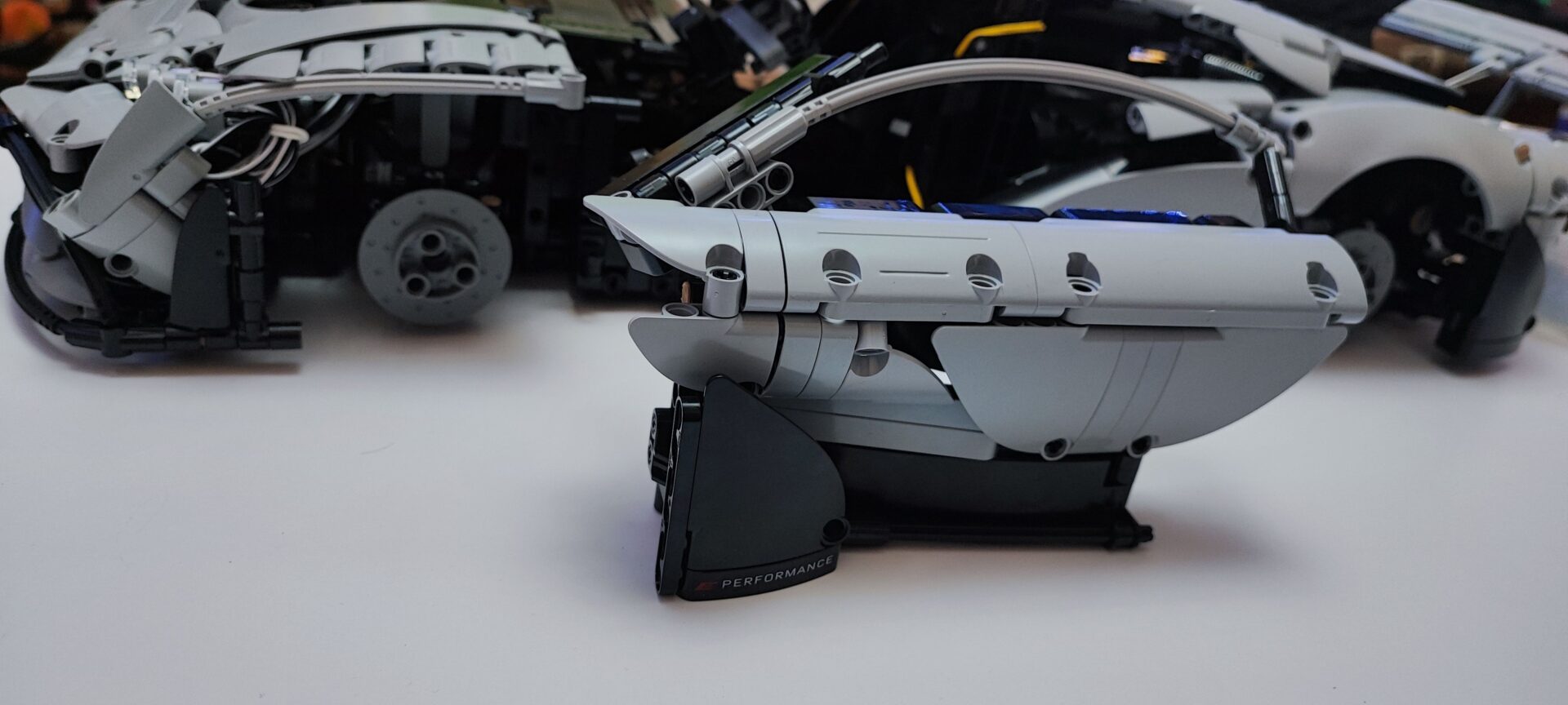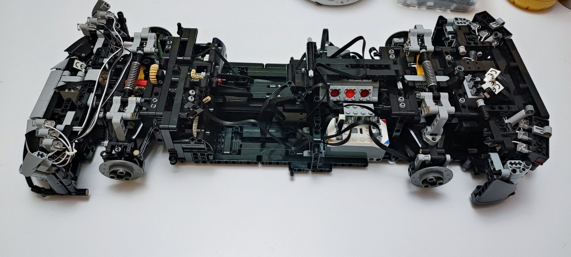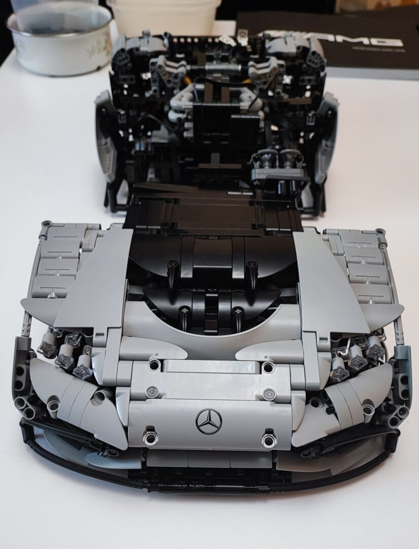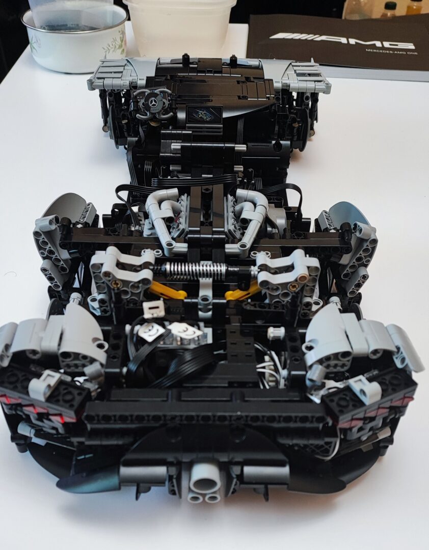 W trzecim kartoniku znajdziemy też woreczki z numerem 4, z których zbudujemy cały tył samochodu wraz ze światłami. Tym samym dochodzi nam kolejna kolekcja kabli z diodami oraz przedłużaczami do nich. Na szczęście światła tylne budujemy w kilku kolejnych krokach, więc żadne kable z tyłu nie będą luźno wisieć. W tym momencie jesteśmy dokładnie w połowie budowania Mercedesa AMG One. Tym samym też najtrudniejsze wyzwanie ze schowaniem wszystkich kabli od świateł oraz przedniego serwo silnika między klockami. Tu niestety muszę dodać małe rozczarowanie z moje strony. Światła świecą tylko, gdy auto jest w ruchu, nie da ich się włączyć, gdy pojazd się nie przemieszcza.