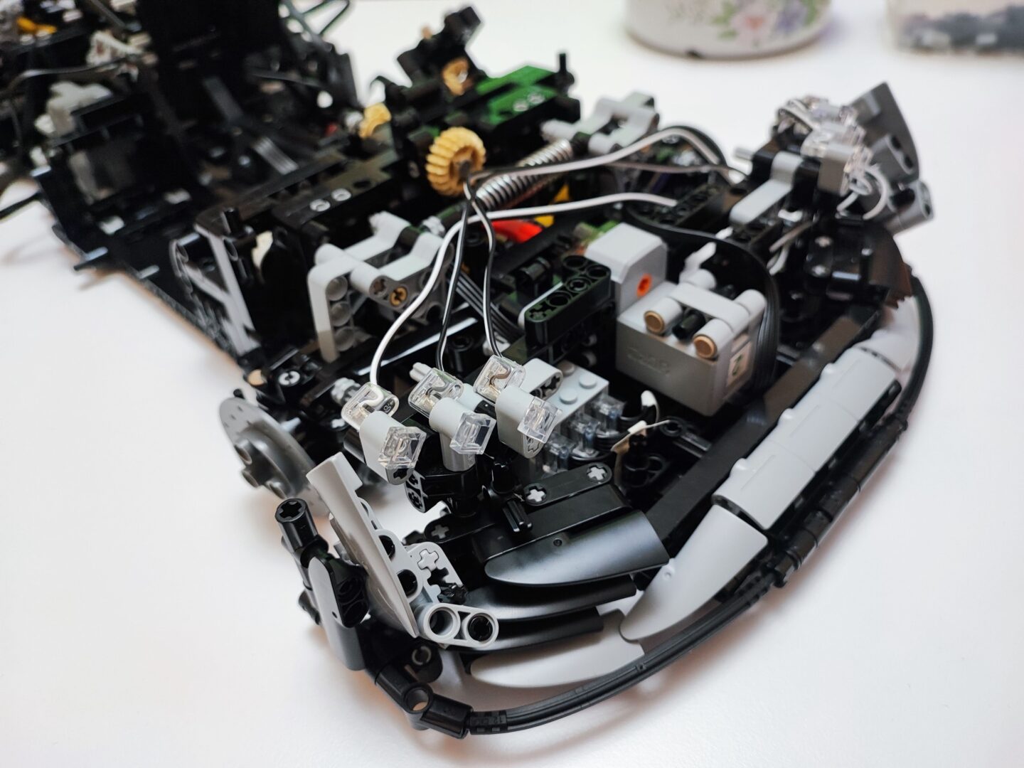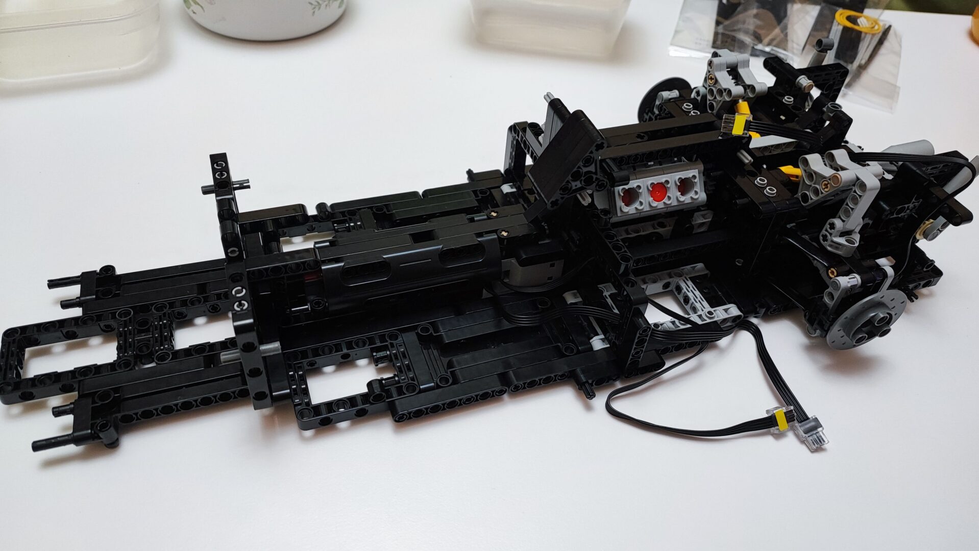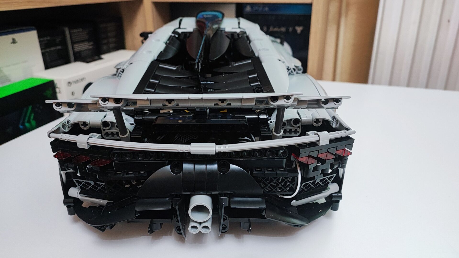 W trzecim kartoniku znajdziemy też woreczki z numerem 4, z których zbudujemy cały tył samochodu wraz ze światłami. Tym samym dochodzi nam kolejna kolekcja kabli z diodami oraz przedłużaczami do nich. Na szczęście światła tylne budujemy w kilku kolejnych krokach, więc żadne kable z tyłu nie będą luźno wisieć. W tym momencie jesteśmy dokładnie w połowie budowania Mercedesa AMG One. Tym samym też najtrudniejsze wyzwanie ze schowaniem wszystkich kabli od świateł oraz przedniego serwo silnika między klockami. Tu niestety muszę dodać małe rozczarowanie z moje strony. Światła świecą tylko, gdy auto jest w ruchu, nie da ich się włączyć, gdy pojazd się nie przemieszcza.