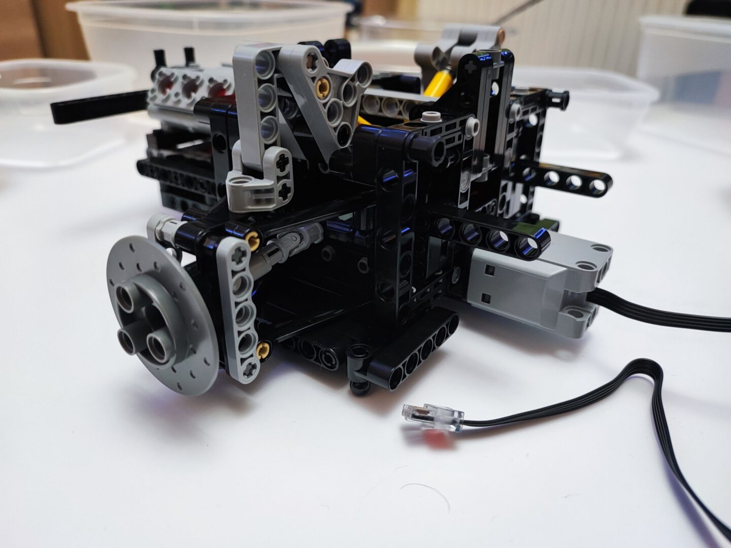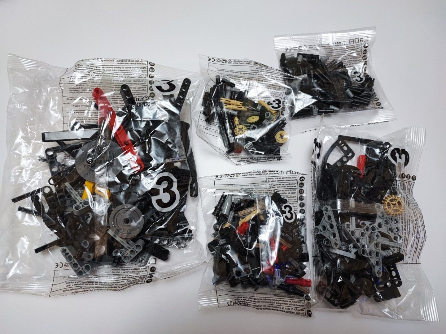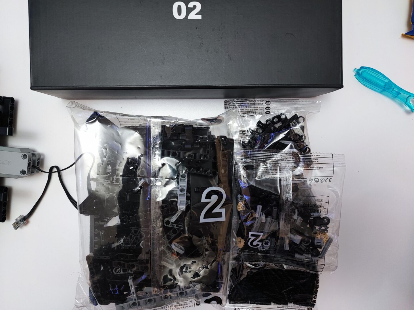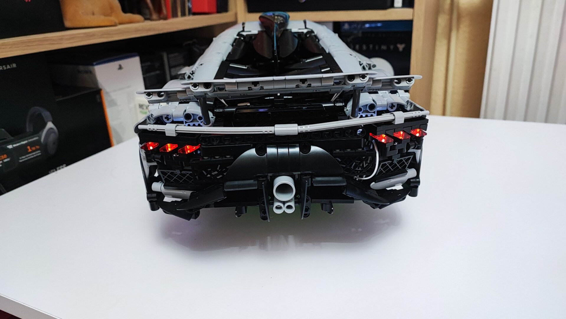 W trzecim kartoniku znajdziemy też woreczki z numerem 4, z których zbudujemy cały tył samochodu wraz ze światłami. Tym samym dochodzi nam kolejna kolekcja kabli z diodami oraz przedłużaczami do nich. Na szczęście światła tylne budujemy w kilku kolejnych krokach, więc żadne kable z tyłu nie będą luźno wisieć. W tym momencie jesteśmy dokładnie w połowie budowania Mercedesa AMG One. Tym samym też najtrudniejsze wyzwanie ze schowaniem wszystkich kabli od świateł oraz przedniego serwo silnika między klockami. Tu niestety muszę dodać małe rozczarowanie z moje strony. Światła świecą tylko, gdy auto jest w ruchu, nie da ich się włączyć, gdy pojazd się nie przemieszcza.