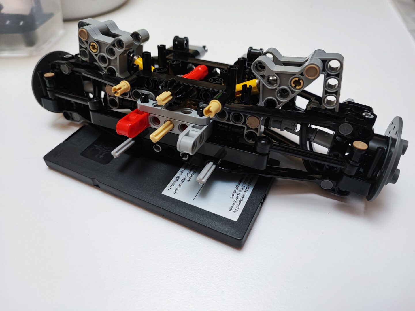 Podobnie jak z modelami LEGO Technic, także w CaDA Master budowanie modelu zaczynamy od tylnej osi oraz silnika. To, co pierwsze rzuca się w oczy, to to, że wszystkie okienka, które mamy gotowe w zestawach LEGO w CaDa musimy zbudować z dwóch klocków w kształcie litery L. To z pewnością ciekawe urozmaicenie, które nie daje nam do myślenia, że budujemy kolejny zestaw od LEGO. Jednak sam silnik i tłoki to dobrze już znane elementy wymyślone przez duńskiego producenta, bez problemu każdy zbuduje ten silnik. Dodatkowo w tylnej osi umieszczamy pierwszy silnik elektryczny. Kół zębatych również dużo tu nie ma — nie budujemy skrzyni biegów, więc nawet mniej doświadczona osoba poradzi sobie z połączeniem tych elementów.