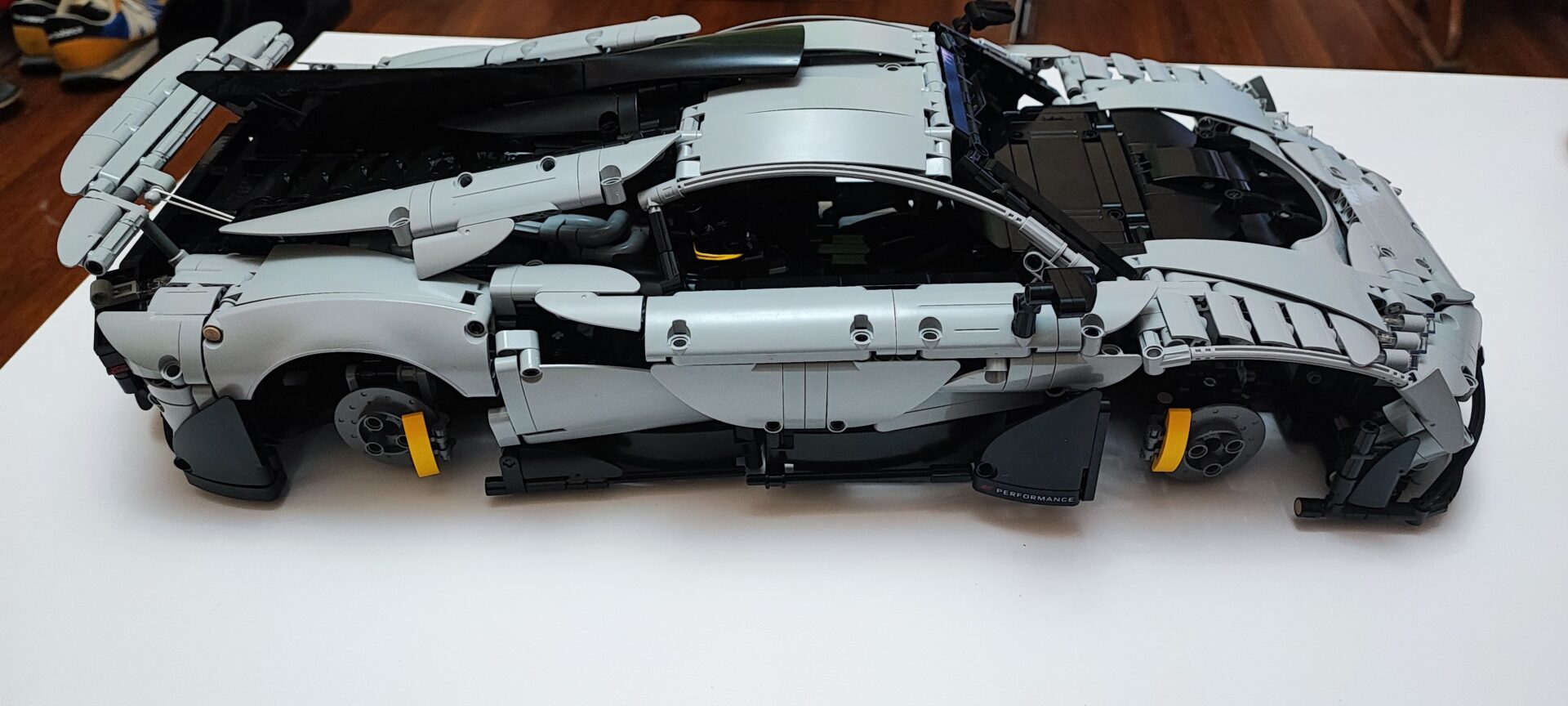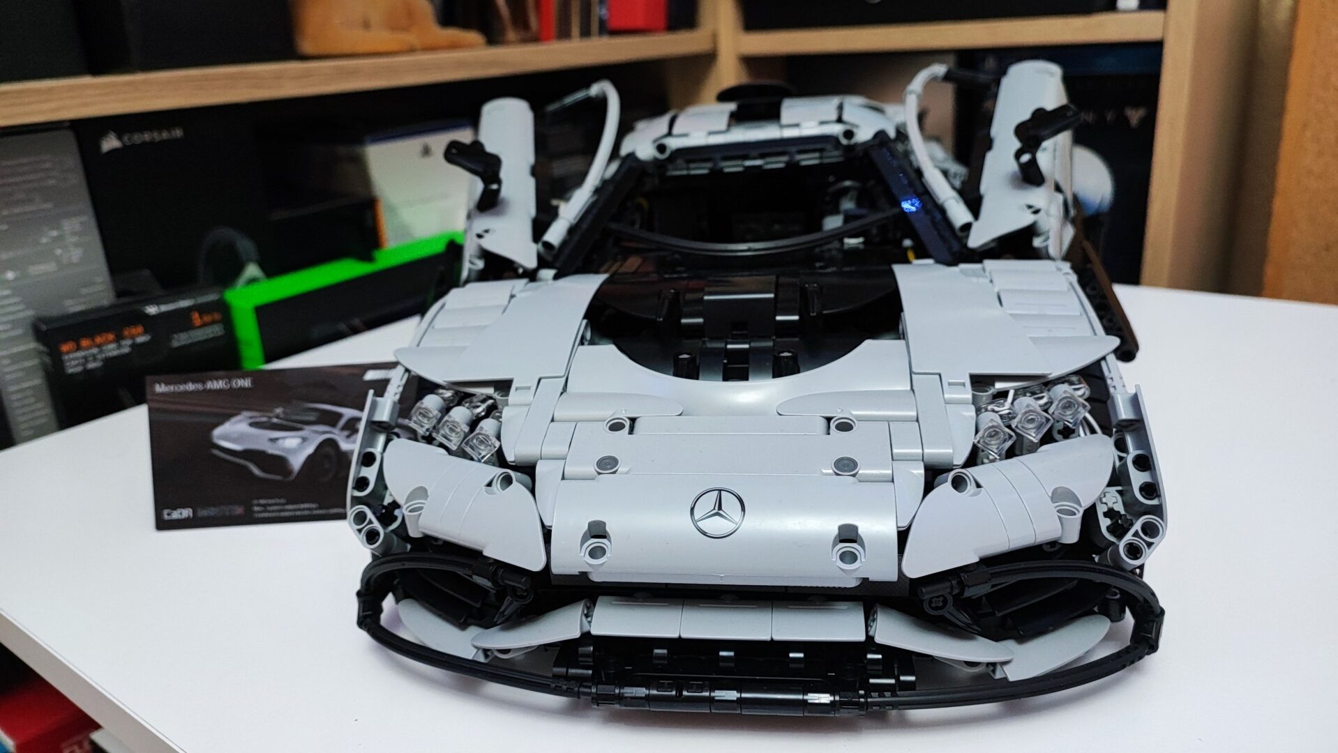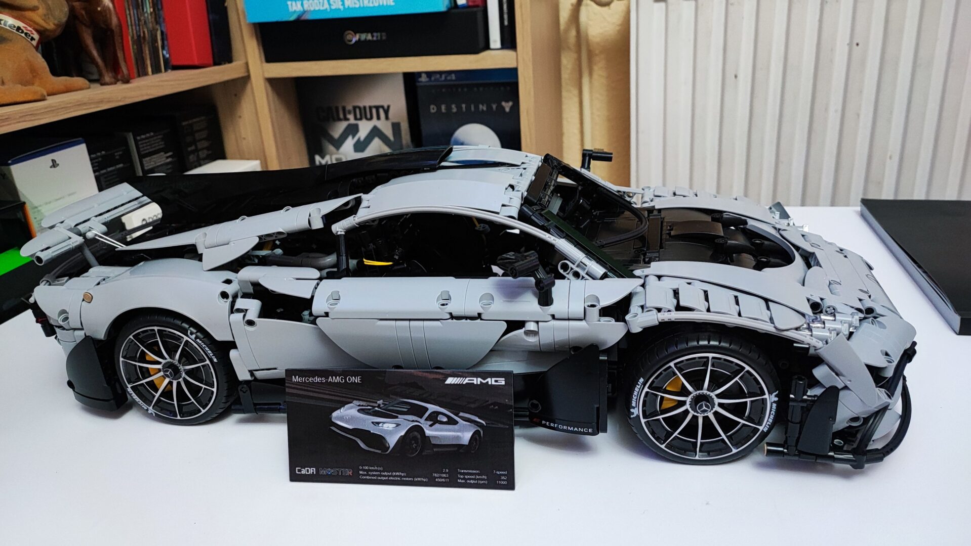 Całość ostatecznie prezentuje się fantastycznie i zajmuje naprawdę sporo miejsca. CaDA Master Mercedes AMG One to bez dwóch zdań imponujący model, w którym zadbano o wiele szczegółów charakterystycznych dla niemieckiego hipersamochodu. Najważniejsze jednak jest to, że klocki chińskiego producenta są wysokiej jakości. W trakcie budowy nic się nie złamało, nic nie odprysnęło, a większość axli wchodziła bez użycia siły. Ostatecznie jestem pod dużym wrażeniem tego modelu i z przyjemnością będę nim się chwalił wśród znajomych. Na sam koniec budowy muszę też producenta bardzo pochwalić za dołączoną dużą tabliczkę, która również jest kolorowym nadrukiem. Znajdziemy na niej zdjęcie prawdziwego AMG One wraz z najważniejszymi parametrami, o których pisałem na początku tego artykułu.