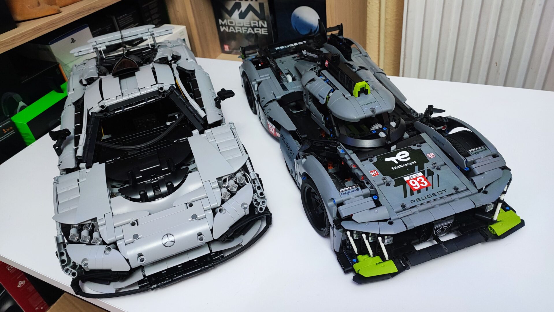 Samo nowe servo silnika potrafi kosztować 59 zł, natomiast koszt jednego z czterech silniczków elektrycznych do napędzania kół to 39 zł. Za samą elektronikę w tym zestawie wychodzi dobre 200-250 zł. Jeżeli obniżymy cenę klocków do 800 zł bez silników, to za jeden element wyjdzie nam 24 grosze. Na poniższym obrazku możecie zobaczyć porównanie AMG One od CaDA z moim największym modelem od LEGO Technic — PEUGEOT 9X8 24H Le Mans Hybrid Hypercar (1775 klocków).