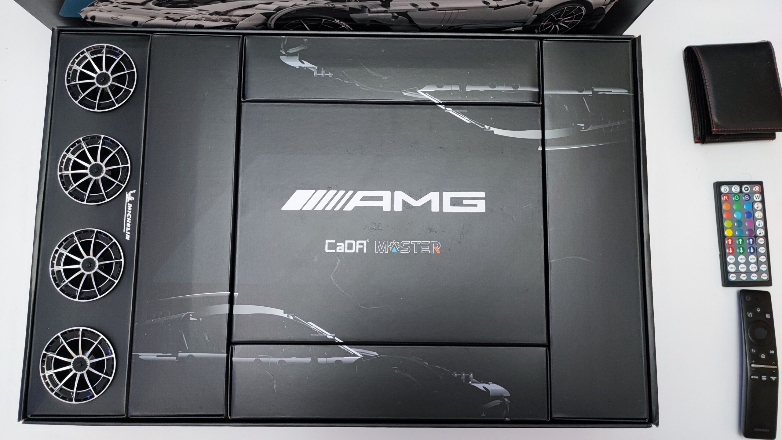 Pudełko CaDA Master Mercedes AMG One wyraźnie pokazuje nam, że mamy do czynienia z produktem klasy Premium. Sam model samochodu jest laminowany. Opakowanie jest ogromne, a jego wymiary to 57 x 37,5 x 15 cm i waży ponad 6 kg. Na szczęście nic nie musimy tu rozrywać — po przecięciu plomb wystarczy zdjąć po prostu górną pokrywę. Naszym oczom okaże się wtedy sześć odpowiednio ponumerowanych pudełek. Największe pudełko z dużym napisem AMG zawiera pilota 2.4 GHz, kabelki do świateł LED oraz silniki elektryczne: