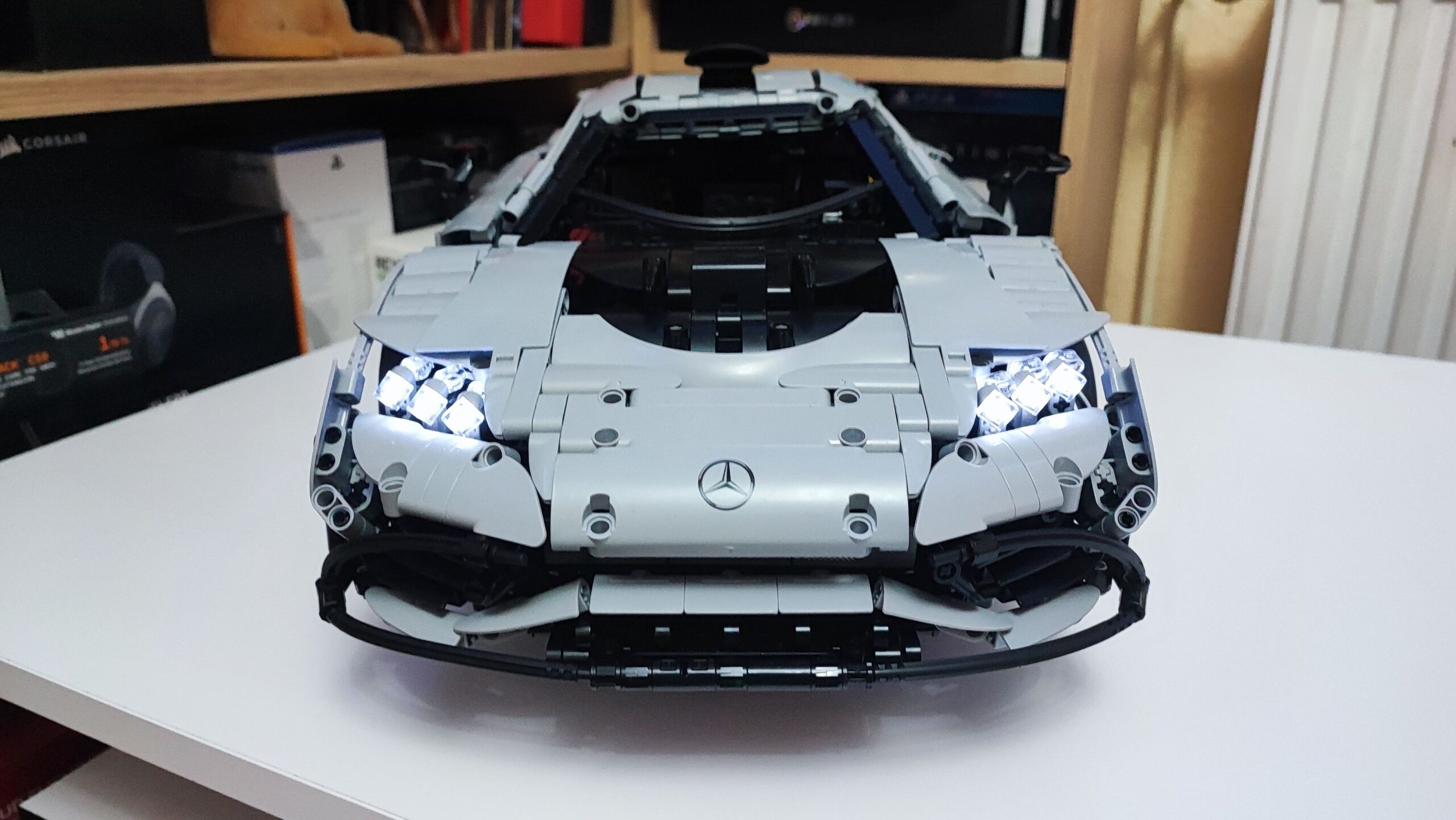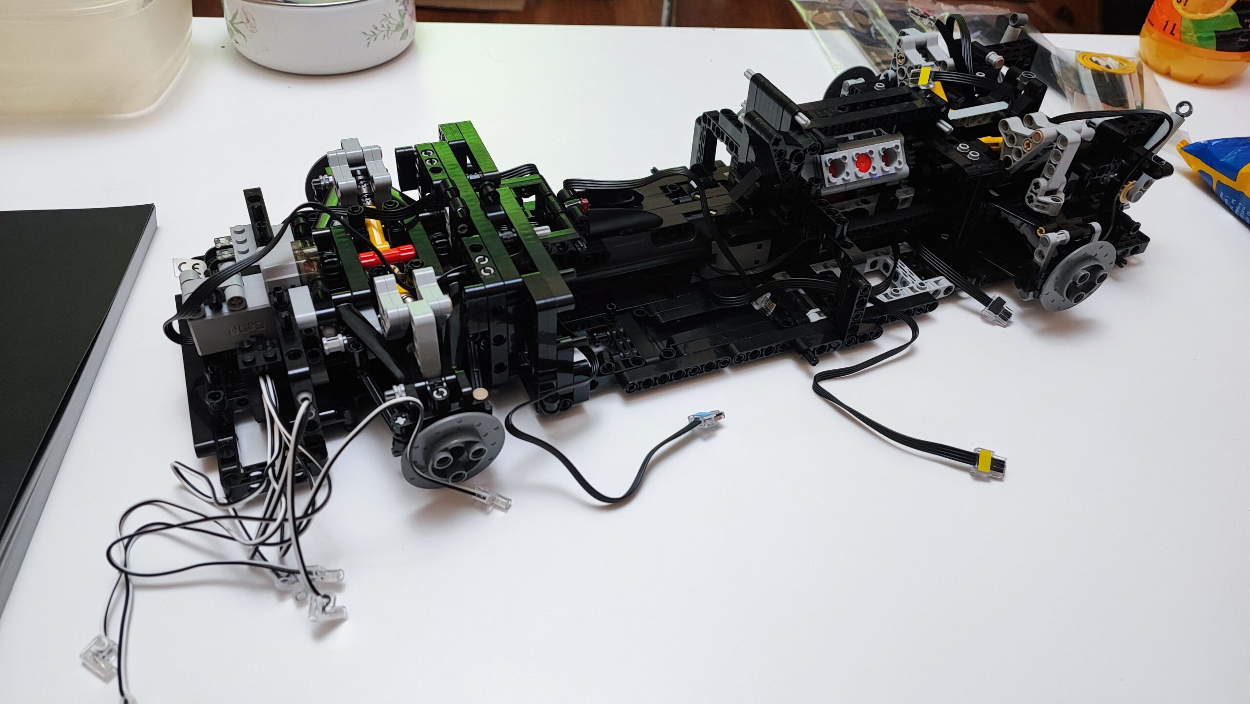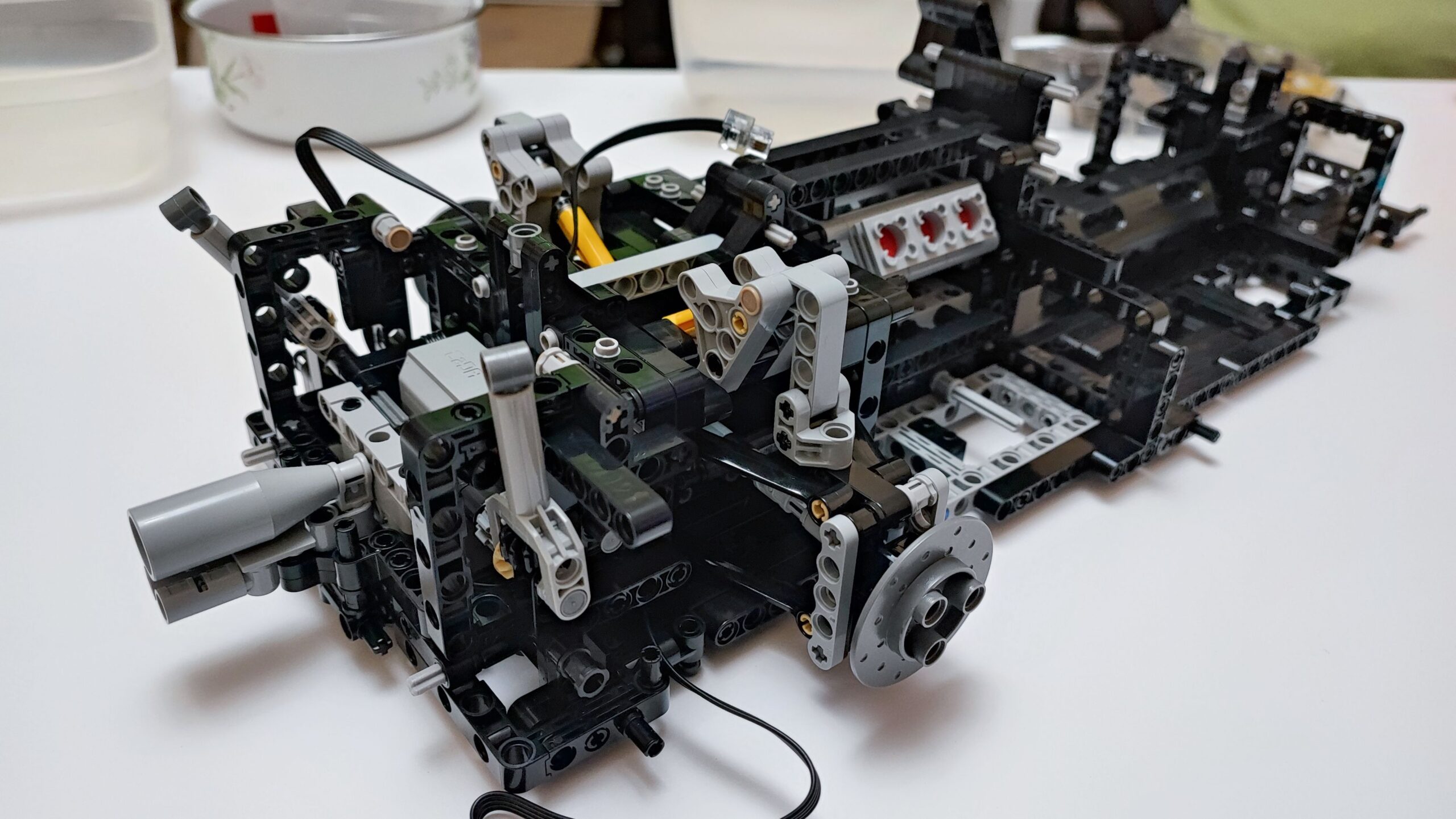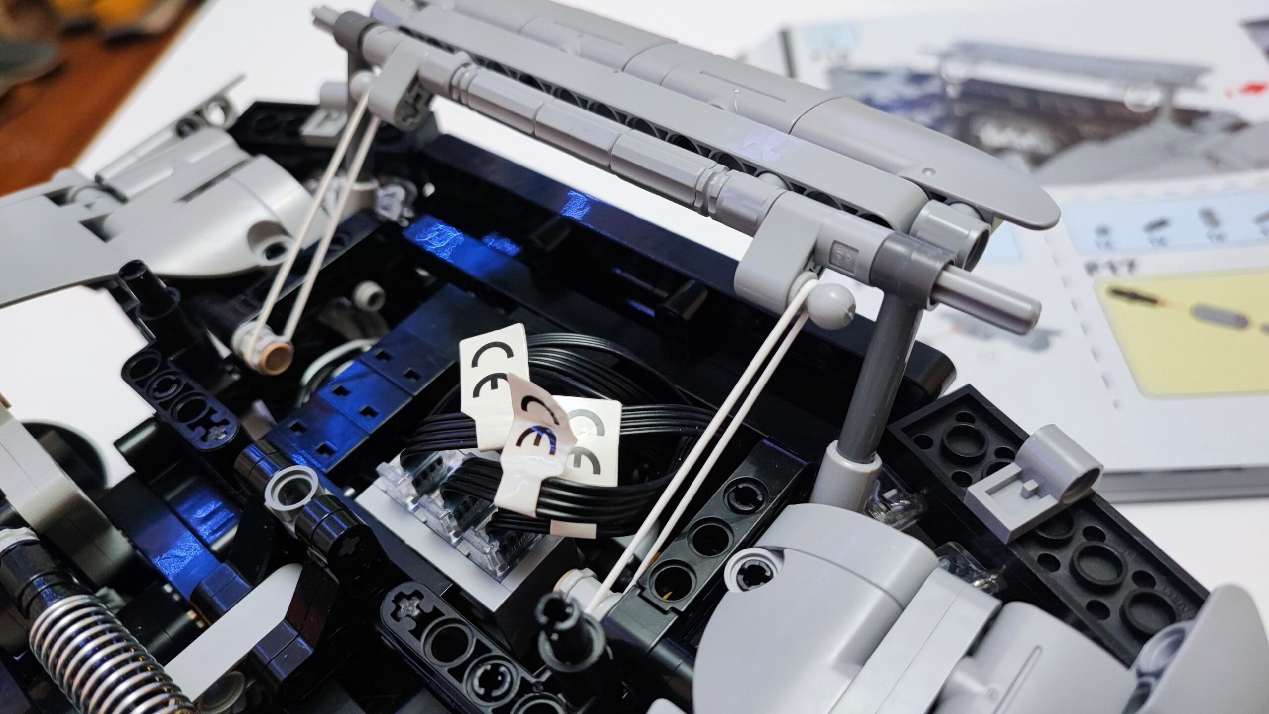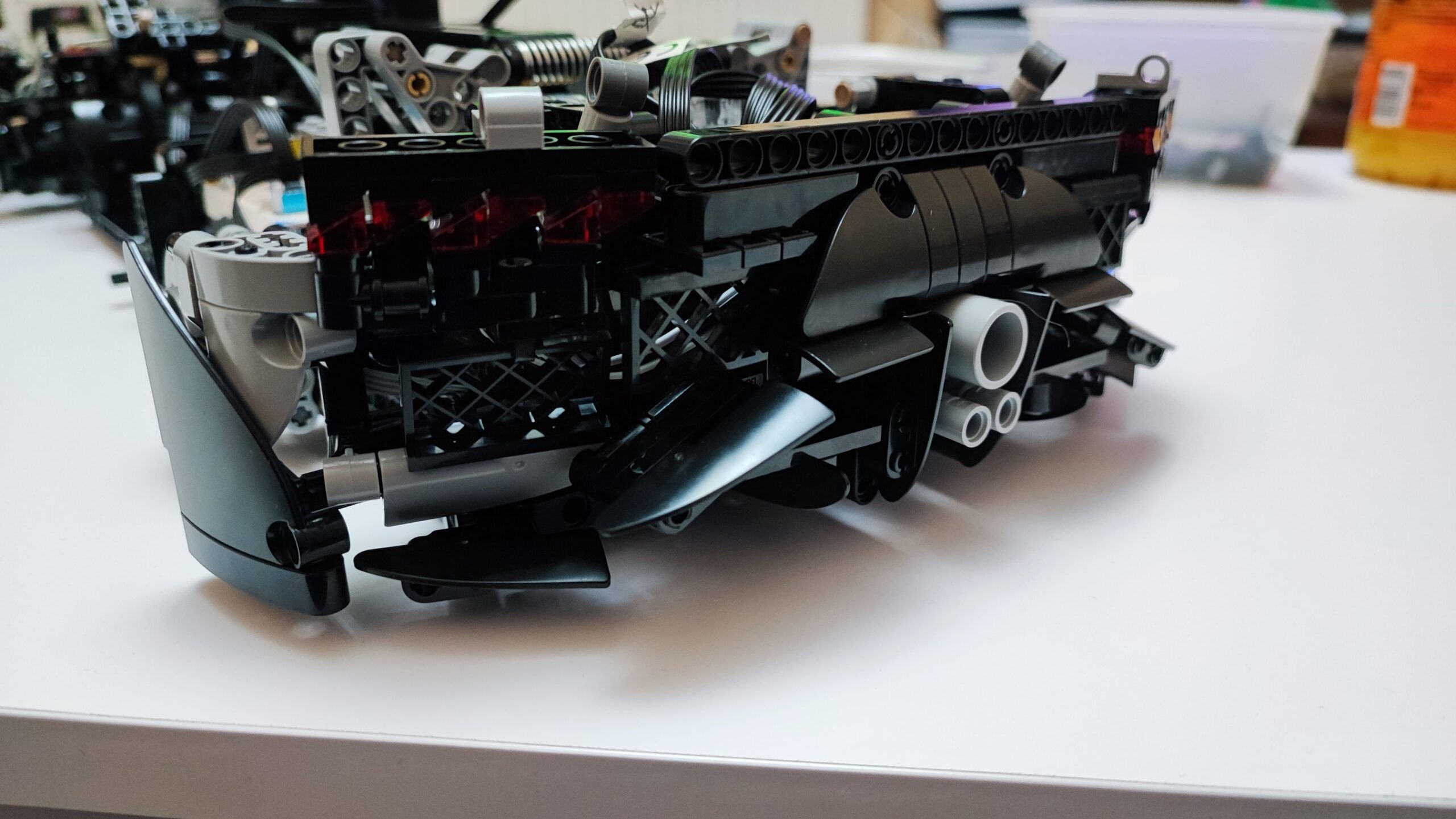 W trzecim kartoniku znajdziemy też woreczki z numerem 4, z których zbudujemy cały tył samochodu wraz ze światłami. Tym samym dochodzi nam kolejna kolekcja kabli z diodami oraz przedłużaczami do nich. Na szczęście światła tylne budujemy w kilku kolejnych krokach, więc żadne kable z tyłu nie będą luźno wisieć. W tym momencie jesteśmy dokładnie w połowie budowania Mercedesa AMG One. Tym samym też najtrudniejsze wyzwanie ze schowaniem wszystkich kabli od świateł oraz przedniego serwo silnika między klockami. Tu niestety muszę dodać małe rozczarowanie z moje strony. Światła świecą tylko, gdy auto jest w ruchu, nie da ich się włączyć, gdy pojazd się nie przemieszcza.