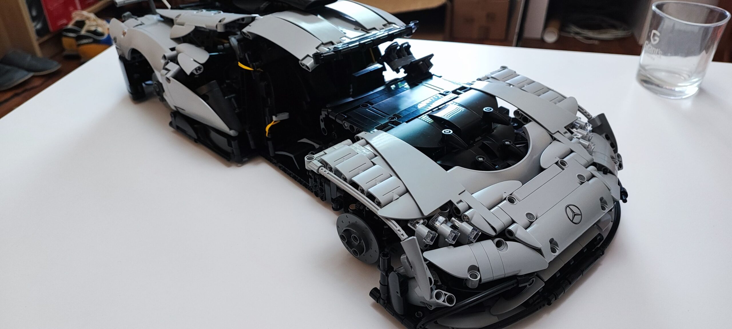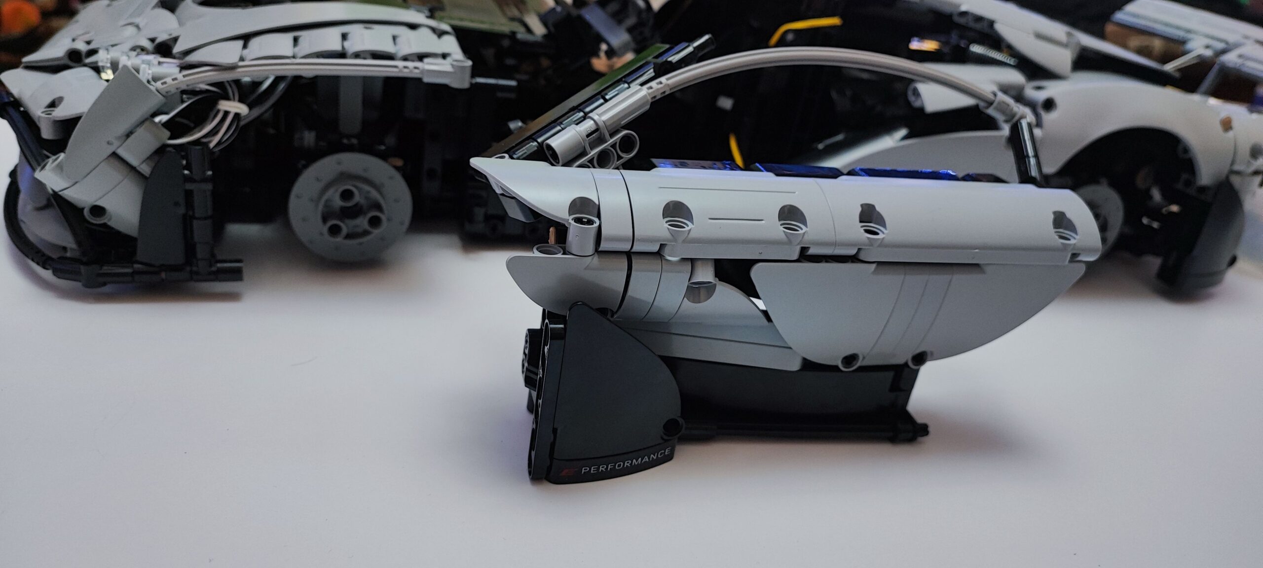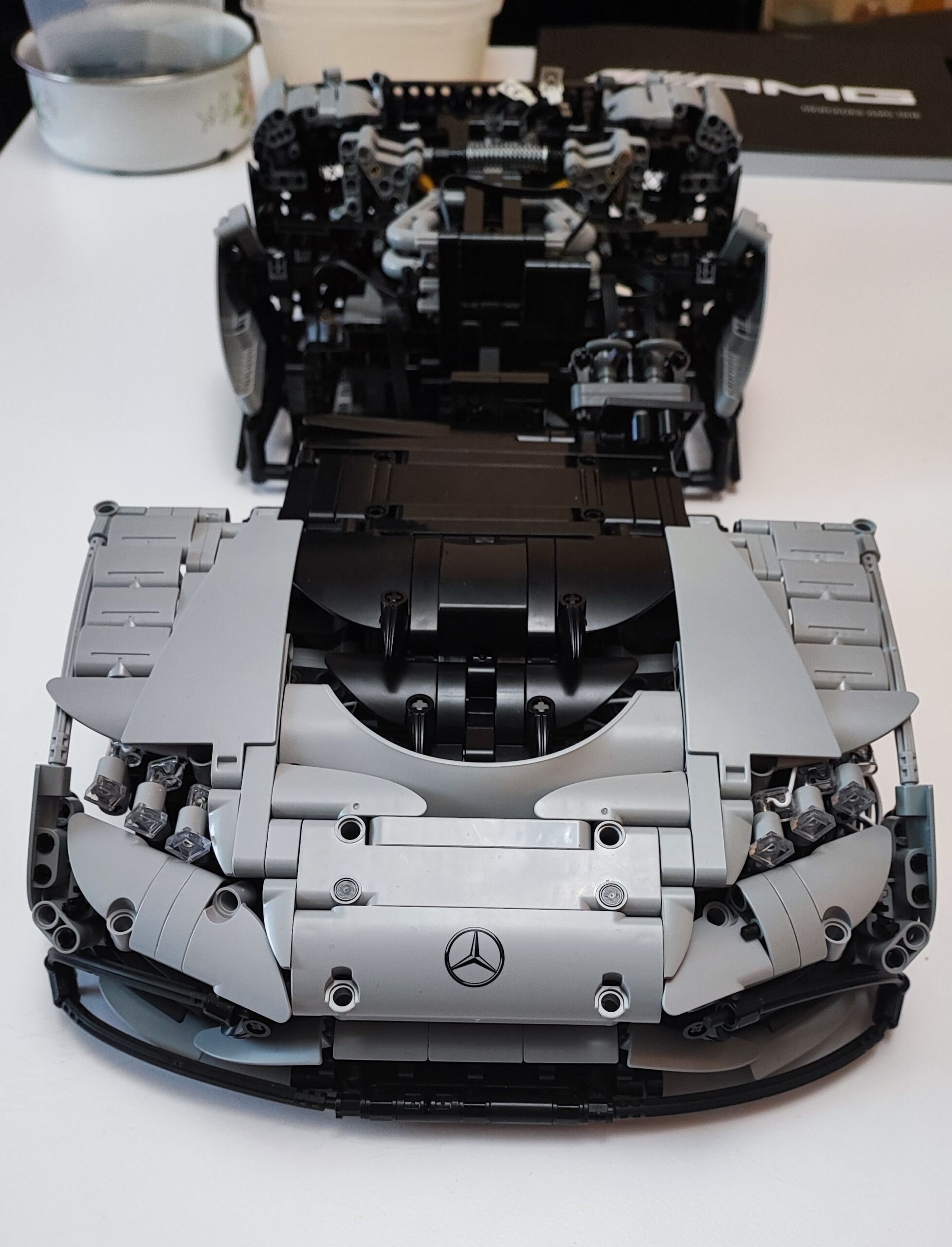 Całość ostatecznie prezentuje się fantastycznie i zajmuje naprawdę sporo miejsca. CaDA Master Mercedes AMG One to bez dwóch zdań imponujący model, w którym zadbano o wiele szczegółów charakterystycznych dla niemieckiego hipersamochodu. Najważniejsze jednak jest to, że klocki chińskiego producenta są wysokiej jakości. W trakcie budowy nic się nie złamało, nic nie odprysnęło, a większość axli wchodziła bez użycia siły. Ostatecznie jestem pod dużym wrażeniem tego modelu i z przyjemnością będę nim się chwalił wśród znajomych. Na sam koniec budowy muszę też producenta bardzo pochwalić za dołączoną dużą tabliczkę, która również jest kolorowym nadrukiem. Znajdziemy na niej zdjęcie prawdziwego AMG One wraz z najważniejszymi parametrami, o których pisałem na początku tego artykułu.