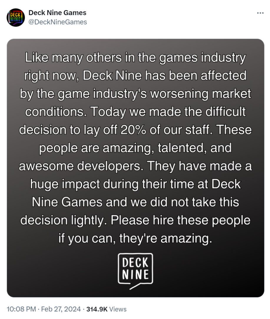 Roszad w Game-Devie nie koniec. Deck Nine ogłosiło wczoraj, że zwalniają 20% pracowników, obwiniając za to pogarszające się warunki w branży.