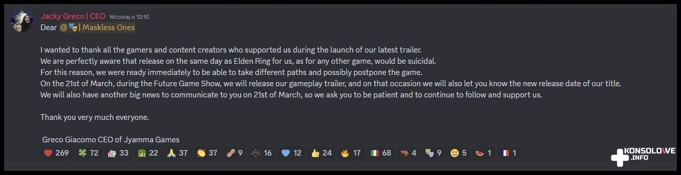 Twórcy Enotrii, studio Jyamma Games, oficjalnie ogłosiło, że zdaje sobie sprawę, iż premiera równocześnie z dodatkiem do Elden Ring, Shadow of the Erdtree, byłaby „samobójstwem”. Na Discordzie gry pojawił się poniższy komunikat.