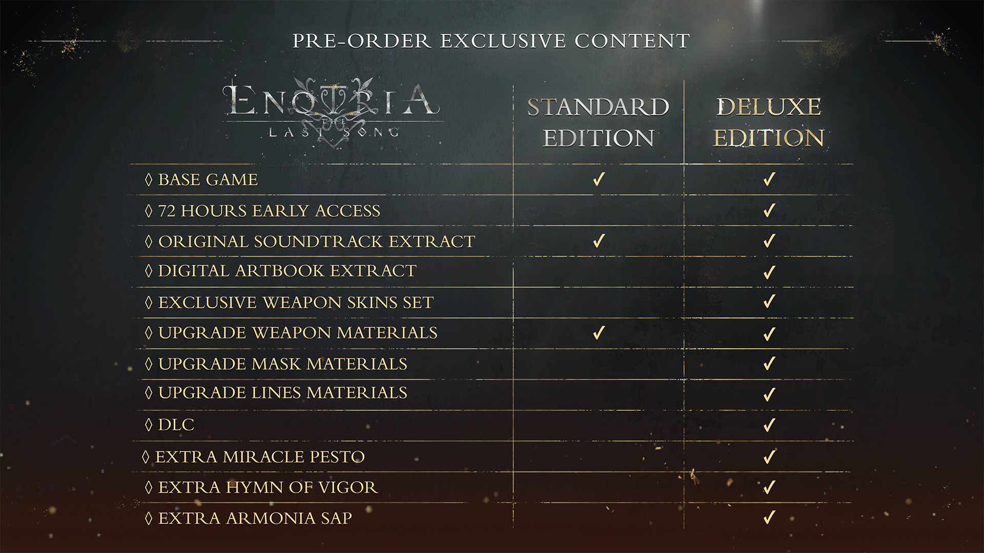 Enotria: The Last Song ukaże się na konsolach PlayStation 5 oraz Xbox Series X|S już 21 czerwca. Tytuł będzie dostępny również na komputerach PC – za pośrednictwem zarówno Steama, jak i Epica. Warto zaznaczyć, że kupując wersję Deluxe, będziemy mogli grać 72 godziny wcześniej, a więc od 18 czerwca. To bynajmniej nie jedyny profit dotyczący tej edycji. Wszystkie związane z nią bonusy (jak też dodatki do zamówień przedpremierowych) znajdziecie wymienione na poniższej rozpisce.