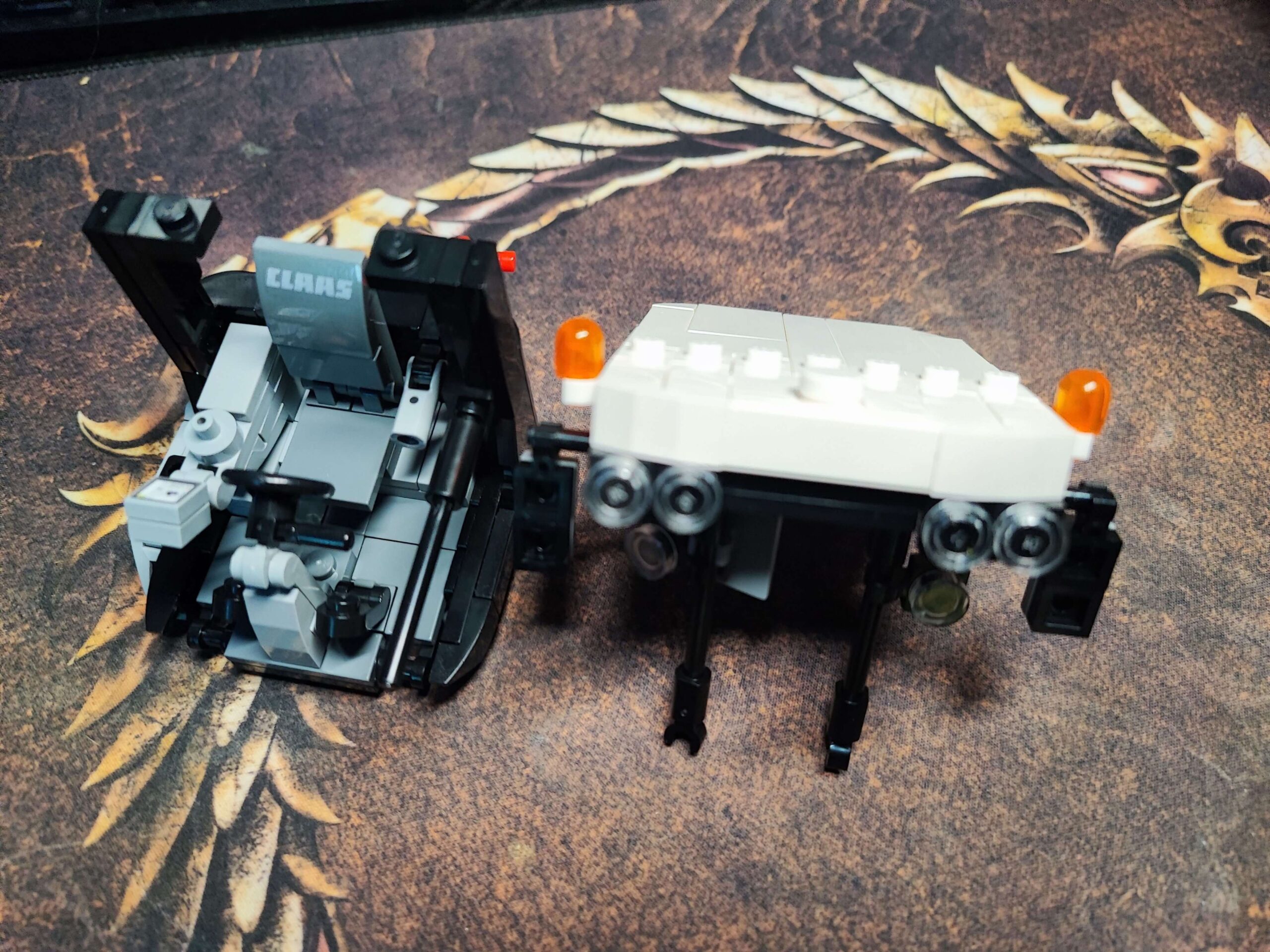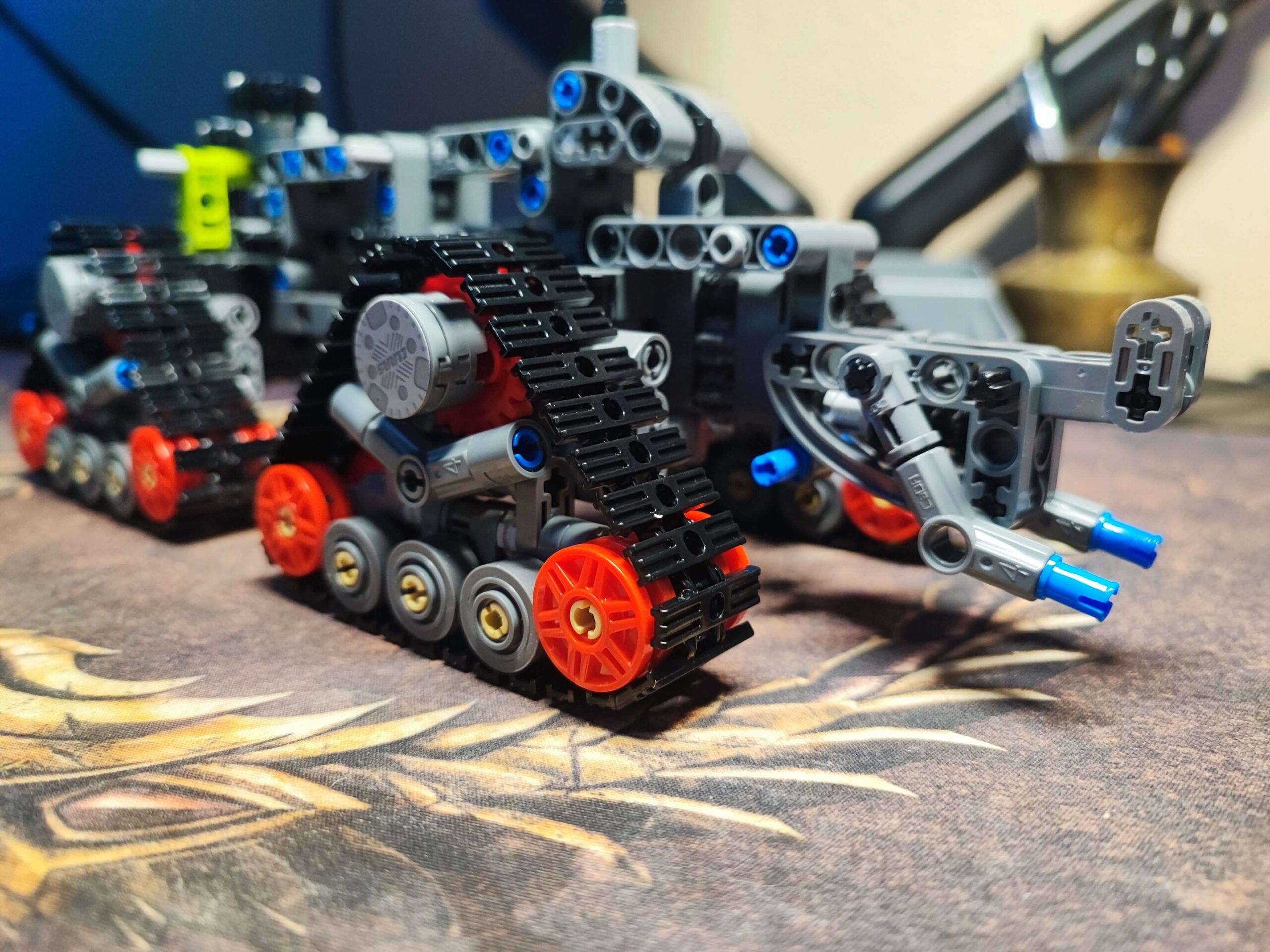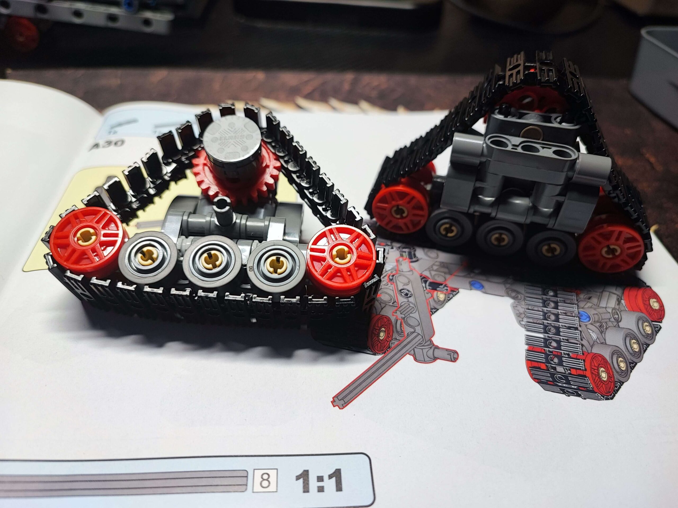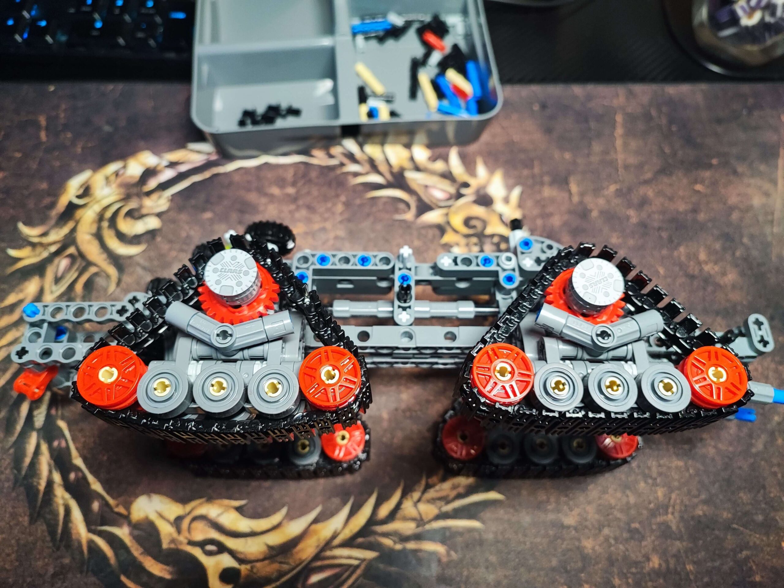 Podwozie opiera się głównie na kilku 15-centymetrowych belkach, wzdłuż których idzie mechanizm skręcający obu osi. Dość szybko przystępujemy do budowy TRAC TS, czyli napędu gąsienicowego. Musimy zbudować cztery takie elementy, każdy składający się z 6 kół oraz gąsienicy. Gąsienicę budujemy sami z 31 mniejszych elementów, które musimy ze sobą połączyć. Niczego nie musimy naciągać, wszystko świetnie się ze sobą łączy. Po uwinięciu się z napędem na tym etapie zbudujemy jeszcze przedni uchwyt dla obciążników oraz oczywiście ruchomy hak z tyłu traktora.