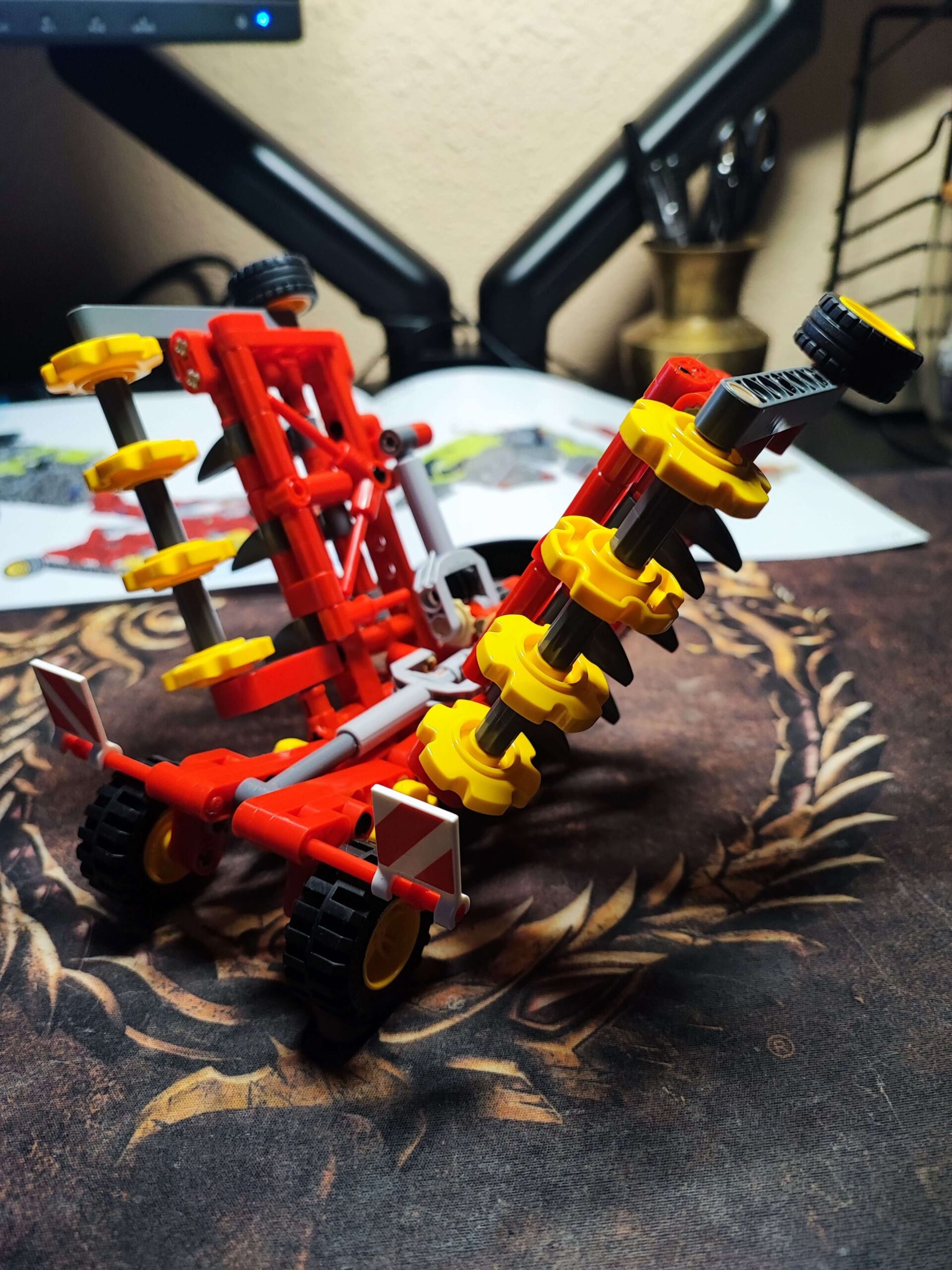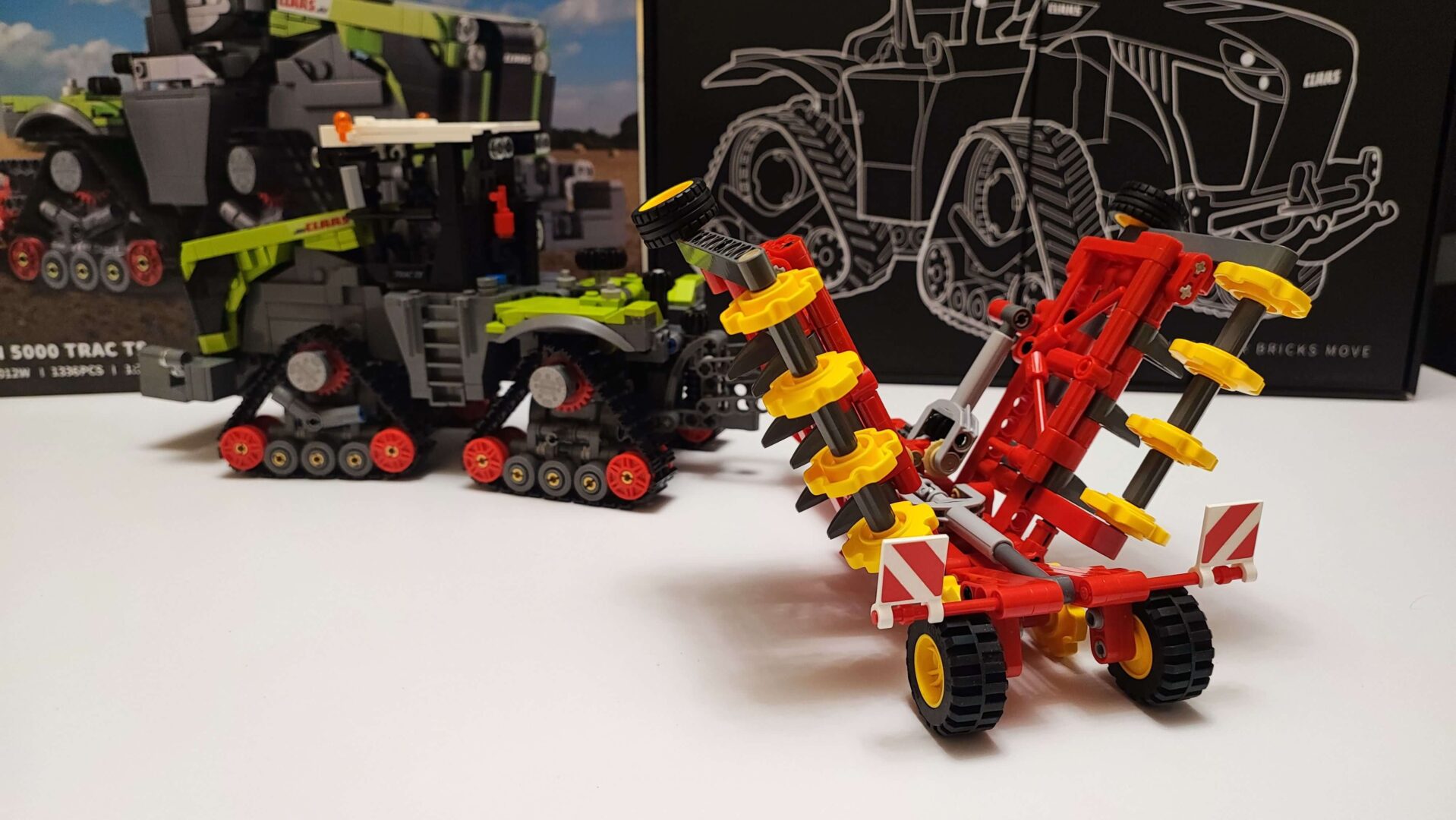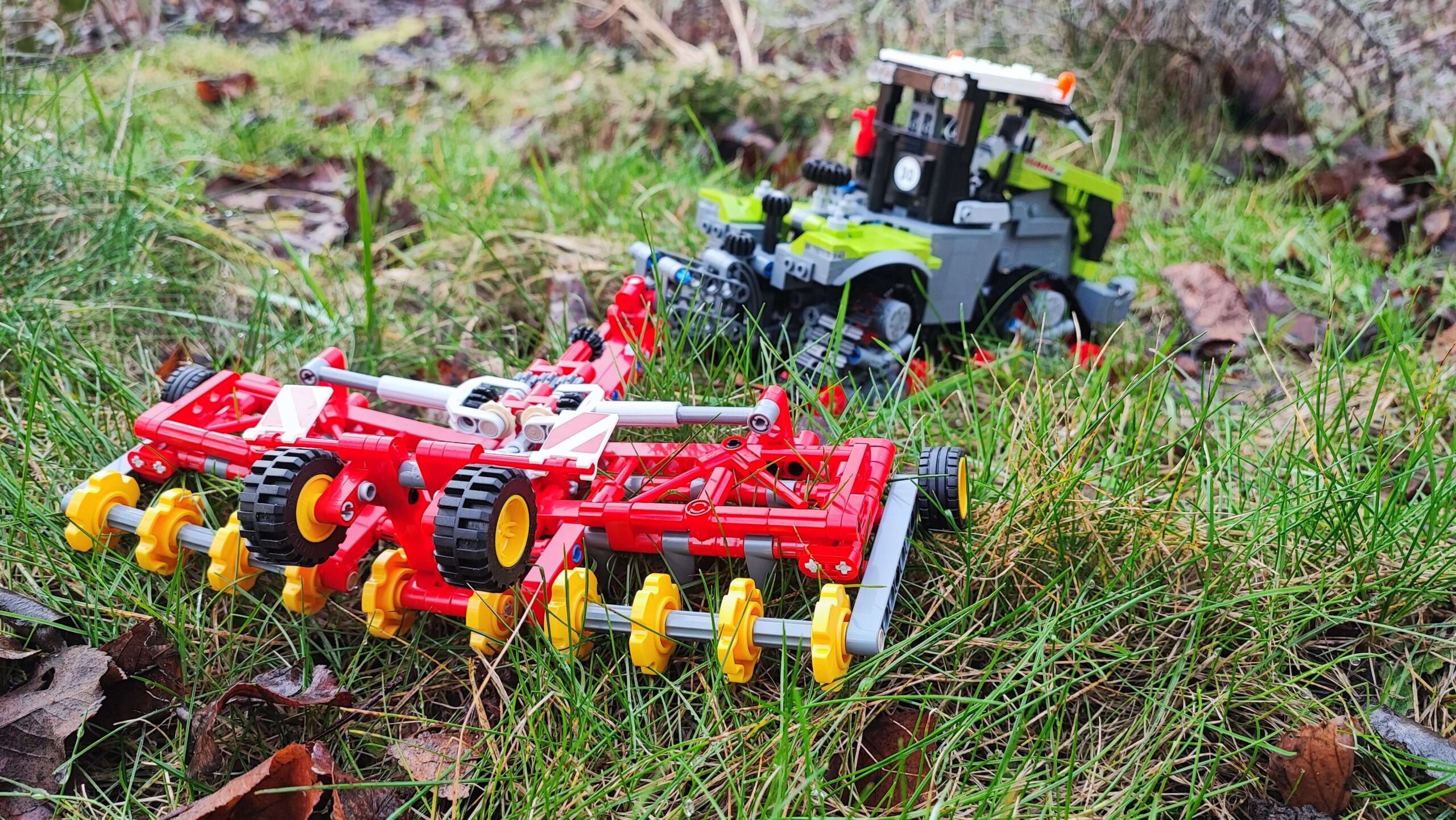 Kultywator budujemy głównie z wielu czerwonych belek, które zawierają ząbki oraz żółte talerze. Młodzież nie powinna mieć większych problemów ze zbudowaniem tej maszyny. Natomiast młodszym budowniczym z pewnością przyda się pomoc osoby dorosłej lub starszego rodzeństwa. Musimy tutaj odpowiednio połączyć trzy elementy pneumatyczne z kilkoma zębatkami. Wszystko musi ze sobą współgrać, aby kultywator równoległe rozkładał oba ramiona. Odpowiada za to odpowiednie pokrętło i przyznaję, że trzeba nim sporo obracać, aby złożyć lub rozłożyć maszynę.