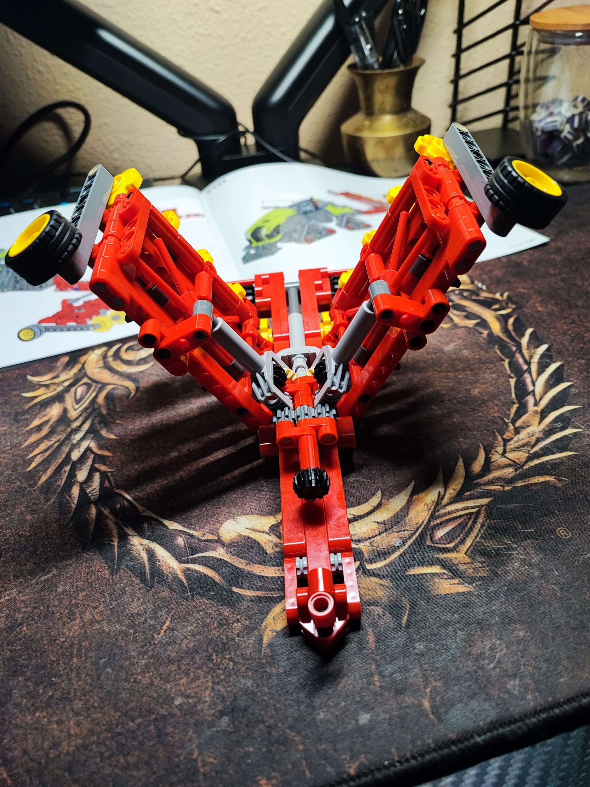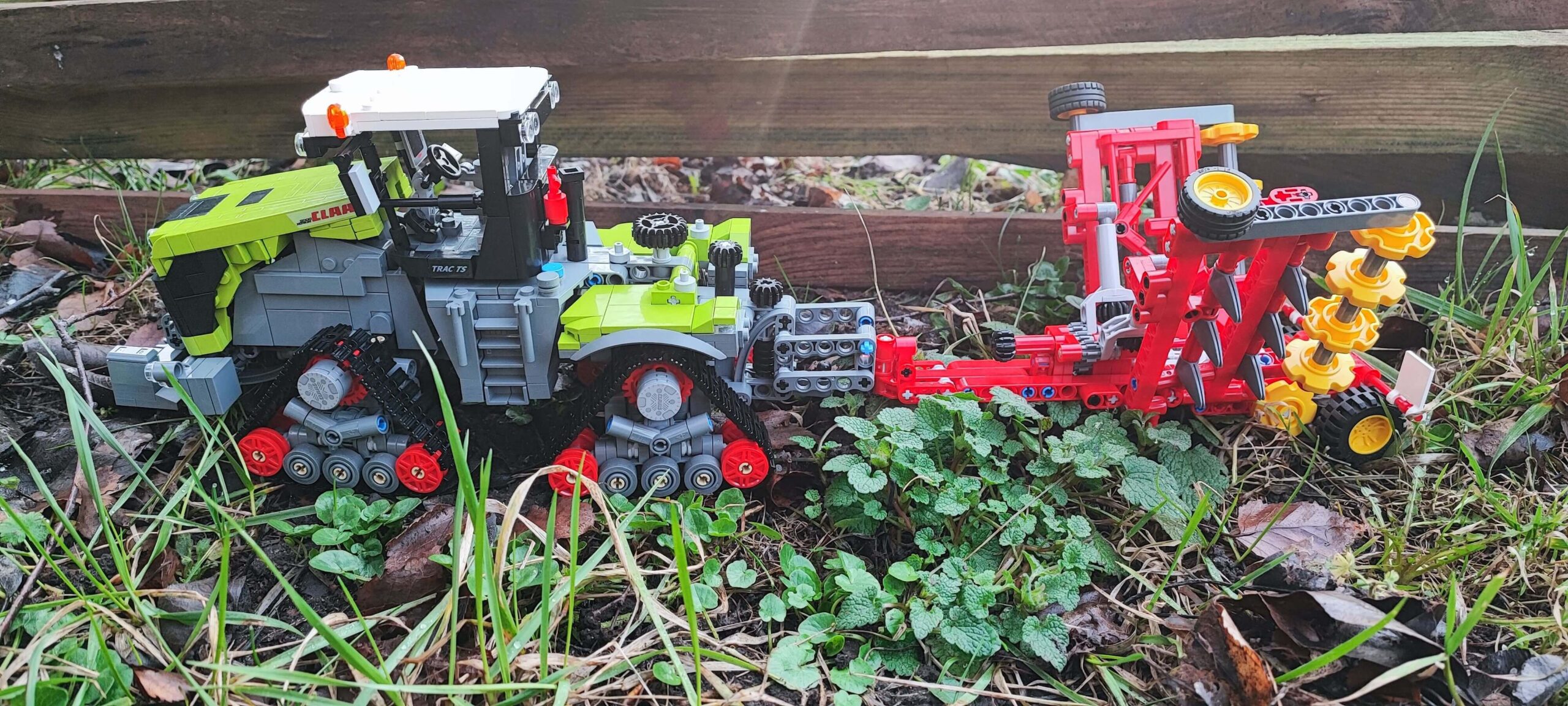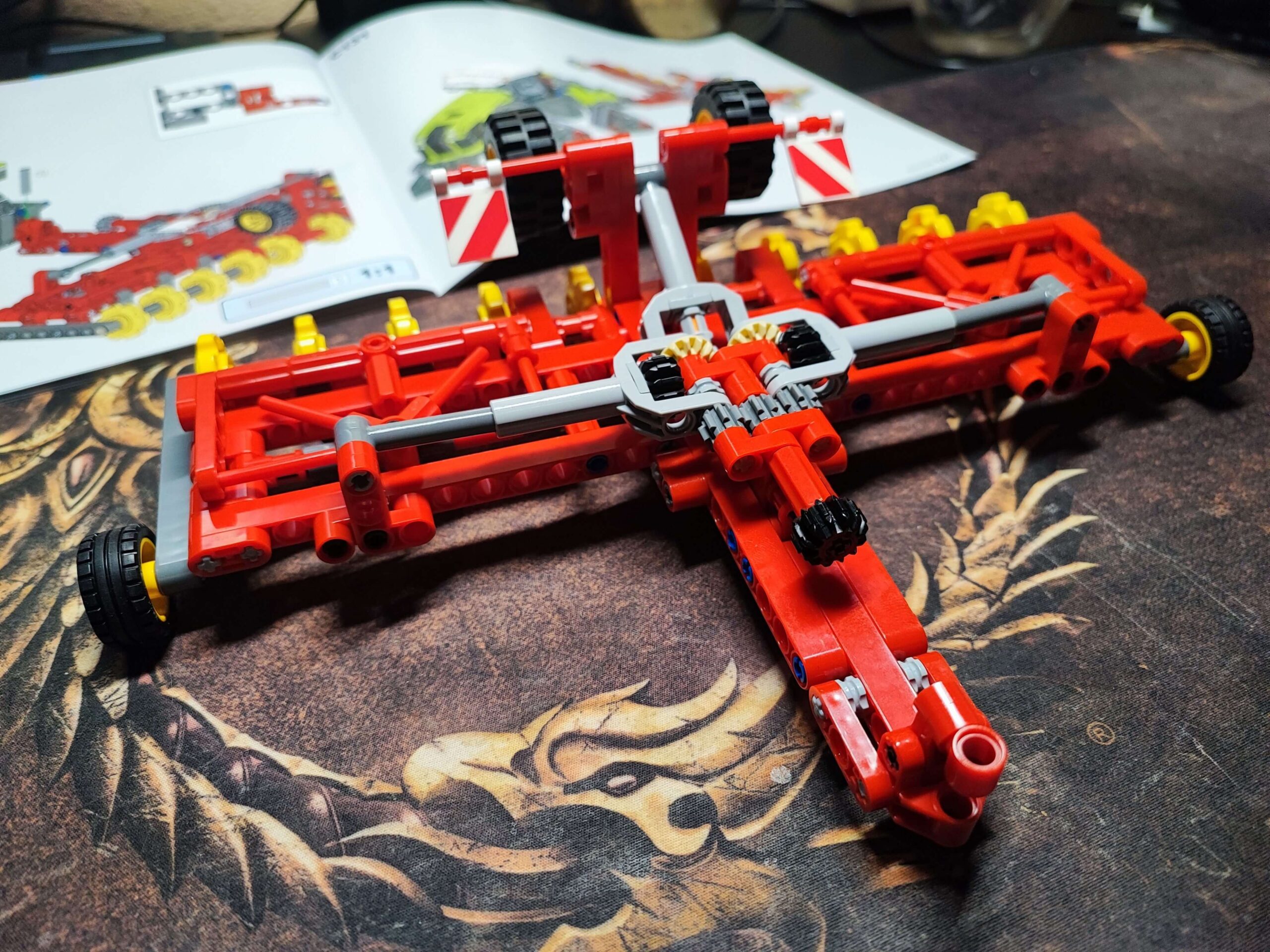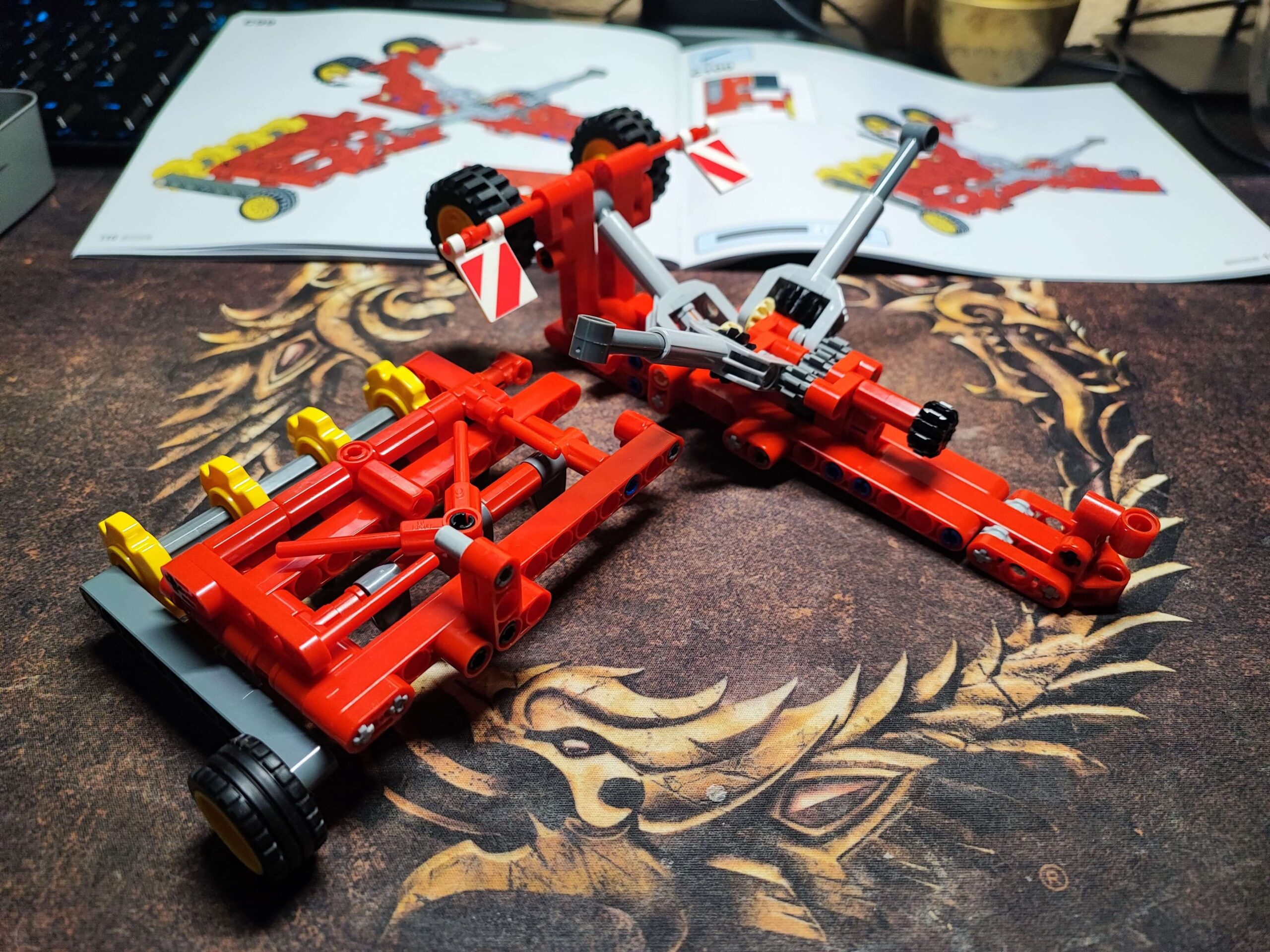 Kultywator budujemy głównie z wielu czerwonych belek, które zawierają ząbki oraz żółte talerze. Młodzież nie powinna mieć większych problemów ze zbudowaniem tej maszyny. Natomiast młodszym budowniczym z pewnością przyda się pomoc osoby dorosłej lub starszego rodzeństwa. Musimy tutaj odpowiednio połączyć trzy elementy pneumatyczne z kilkoma zębatkami. Wszystko musi ze sobą współgrać, aby kultywator równoległe rozkładał oba ramiona. Odpowiada za to odpowiednie pokrętło i przyznaję, że trzeba nim sporo obracać, aby złożyć lub rozłożyć maszynę.