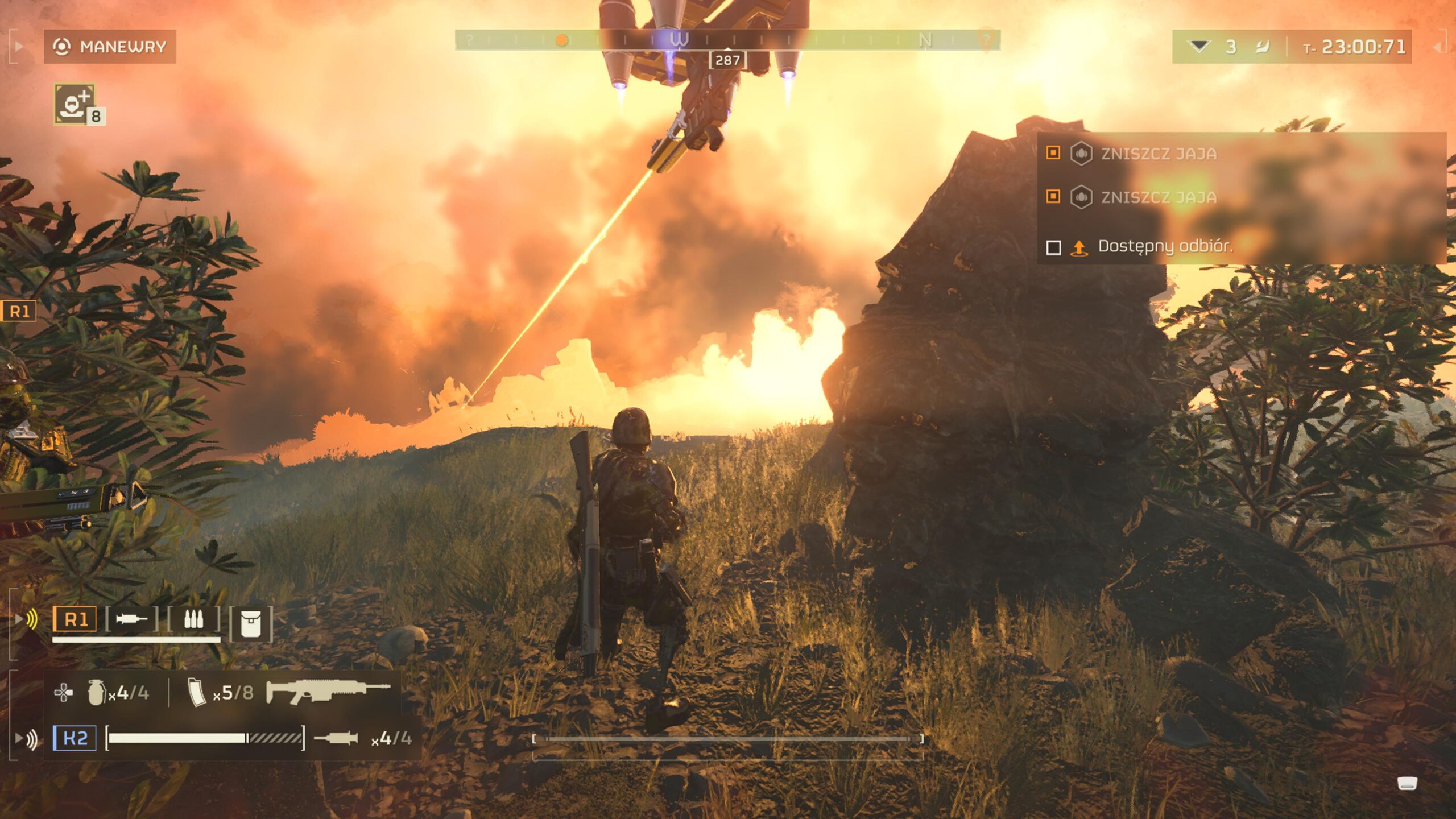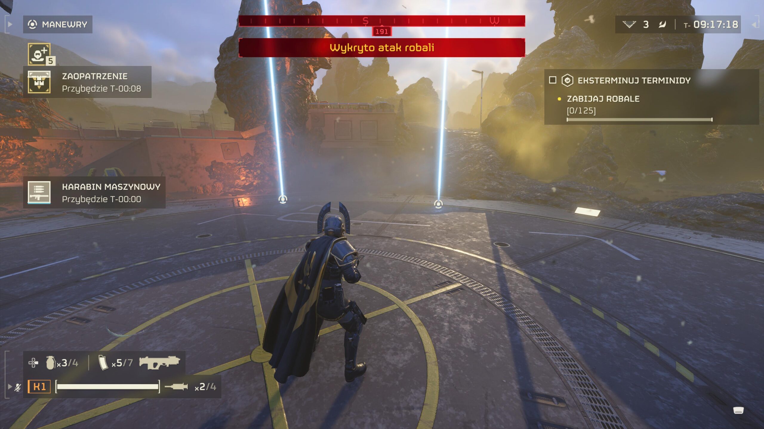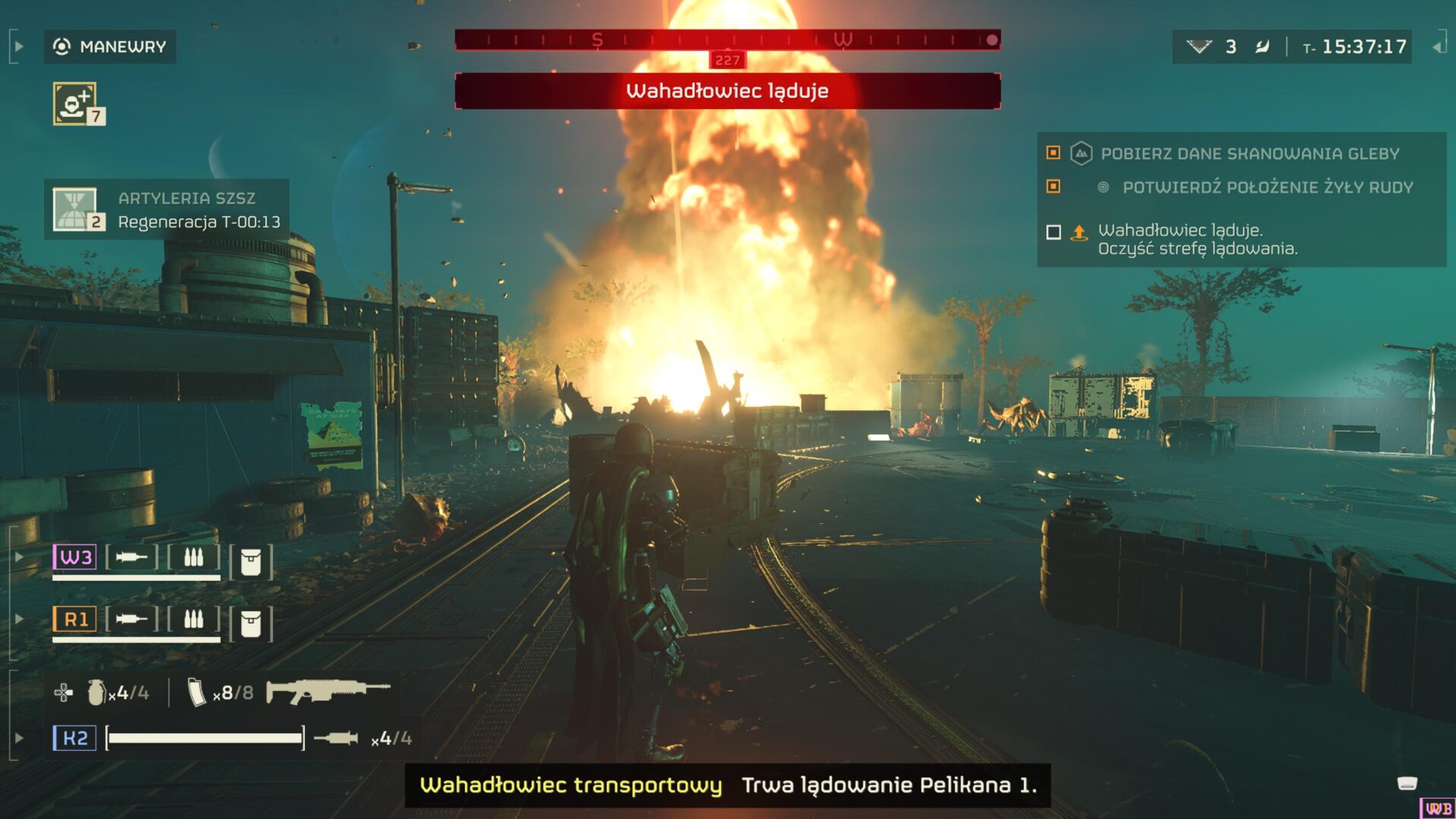 Manewry czy zaopatrzenie, podobnie jak w pierwszej części, wzywamy przez radio. Wybieramy interesującą nasz rzecz, a następnie za pomocą strzałek kierunkowych wklepujemy kod do jej realizacji. Małym ułatwieniem w drugiej części Helldivers jest to, że możemy się poruszać i jednocześnie wklepywać kod. Niestety bieganie zostało ograniczone przez pasek staminy. Gdy się wyczerpie, to nasza postać zacznie wolno truchtać.
