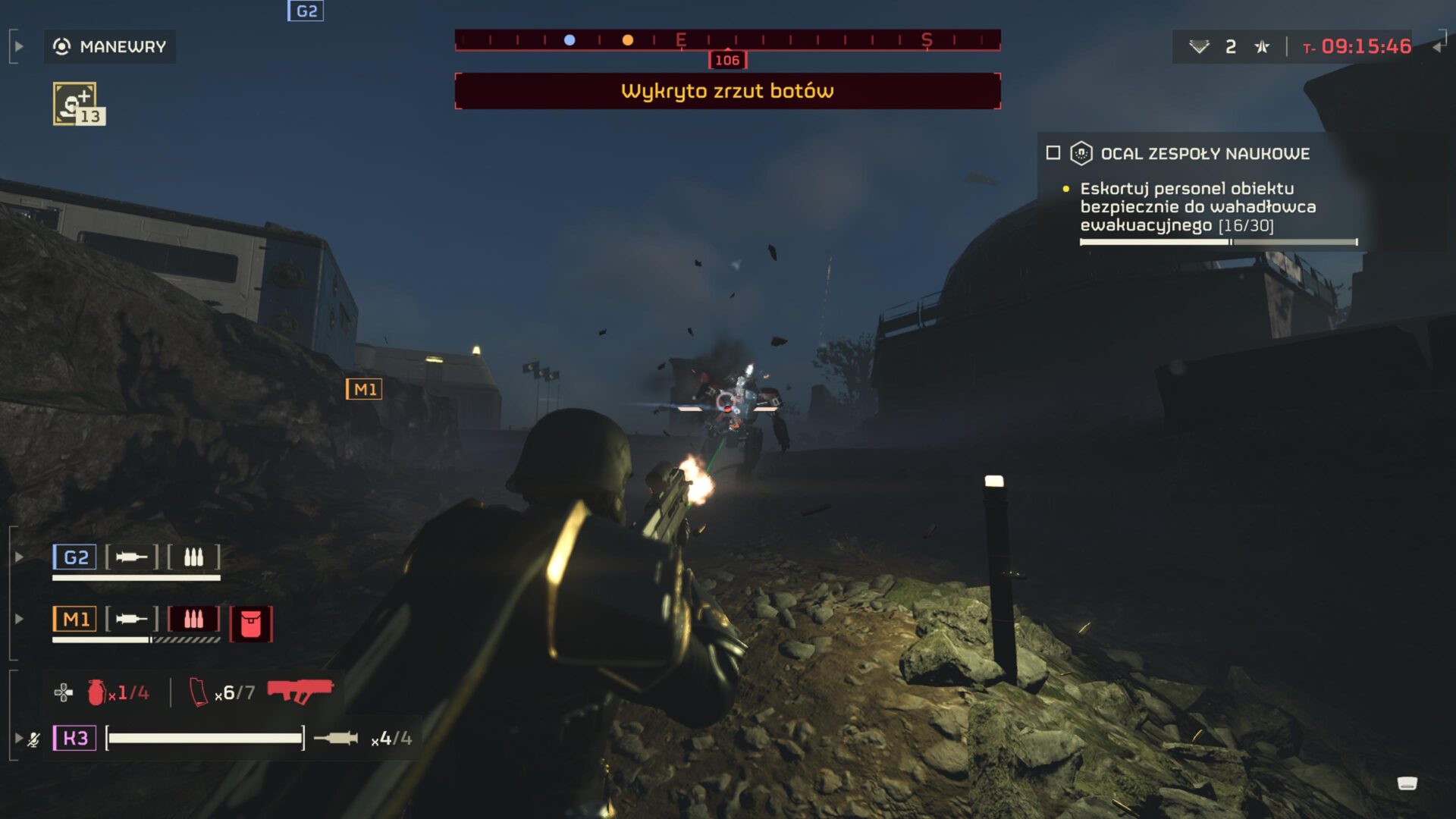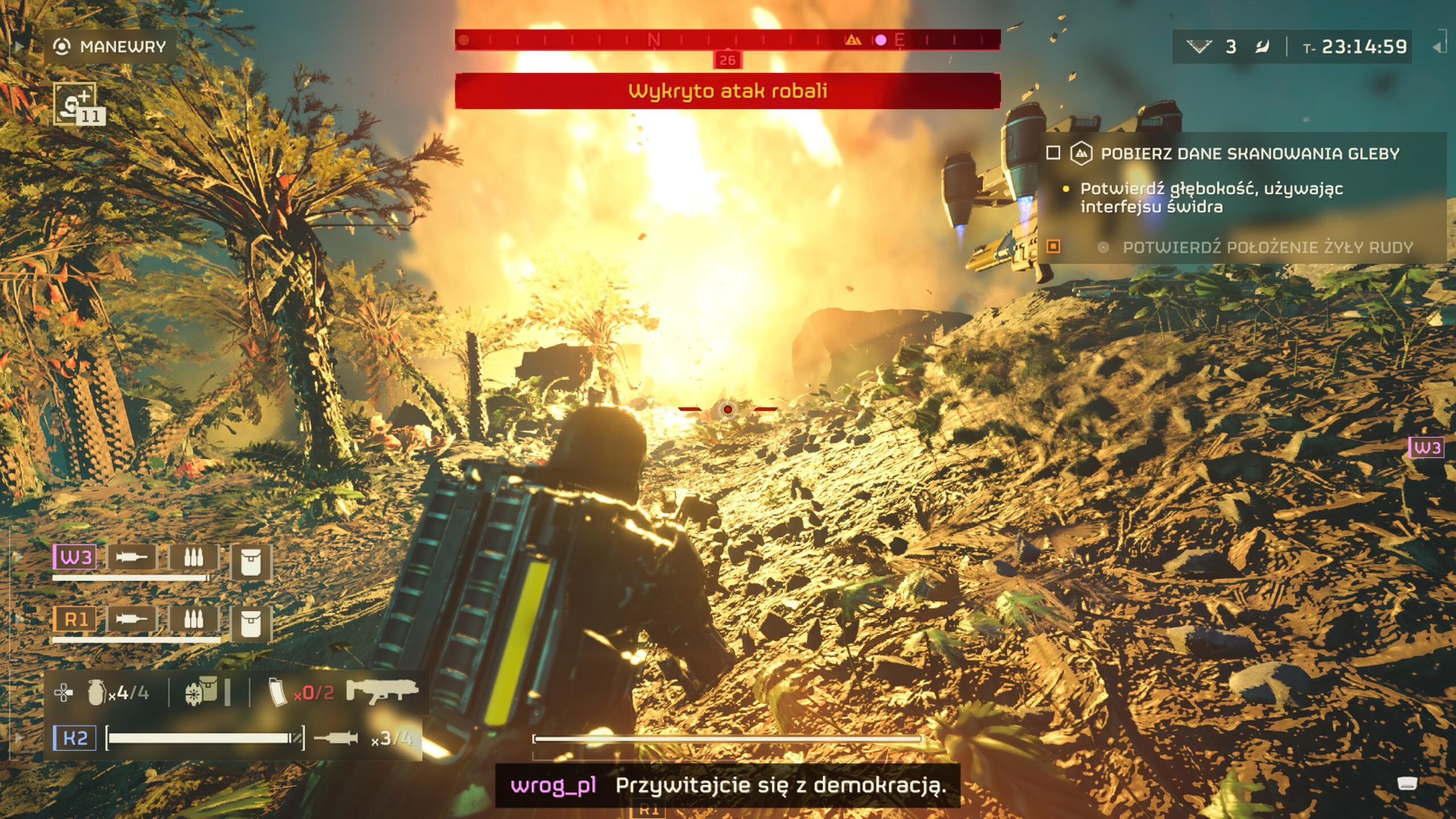 Dokładnie tydzień po premierze Helldivers 2 otrzymało dodatkowy tryb rozgrywki. Misja nazywa się “Przejmij ważny personel” i polega na uwolnieniu 30 więźniów, których wypuszczamy po kilku z cel. Cały czas z kosmicznych statków spadają nam na głowę roboty. Im wyższy poziom trudności wybierzemy, z tym potężniejszymi przeciwnikami mamy do czynienia. Na poziomach 1 – 2 walczymy z małymi robotami znanymi z filmu Terminator, natomiast na poziomie trzecim wróg wysyła już mechy i roboty przypominające AT-ST z Gwiezdnych Wojen. Śmiało mogę stwierdzić, że Helldivers 2 to dwie gry w jednym. Jedna to wesołe i beztroskie strzelanie do robali, a druga to taktyczna strzelanka i zachowawcza walka z uzbrojonymi robotami.