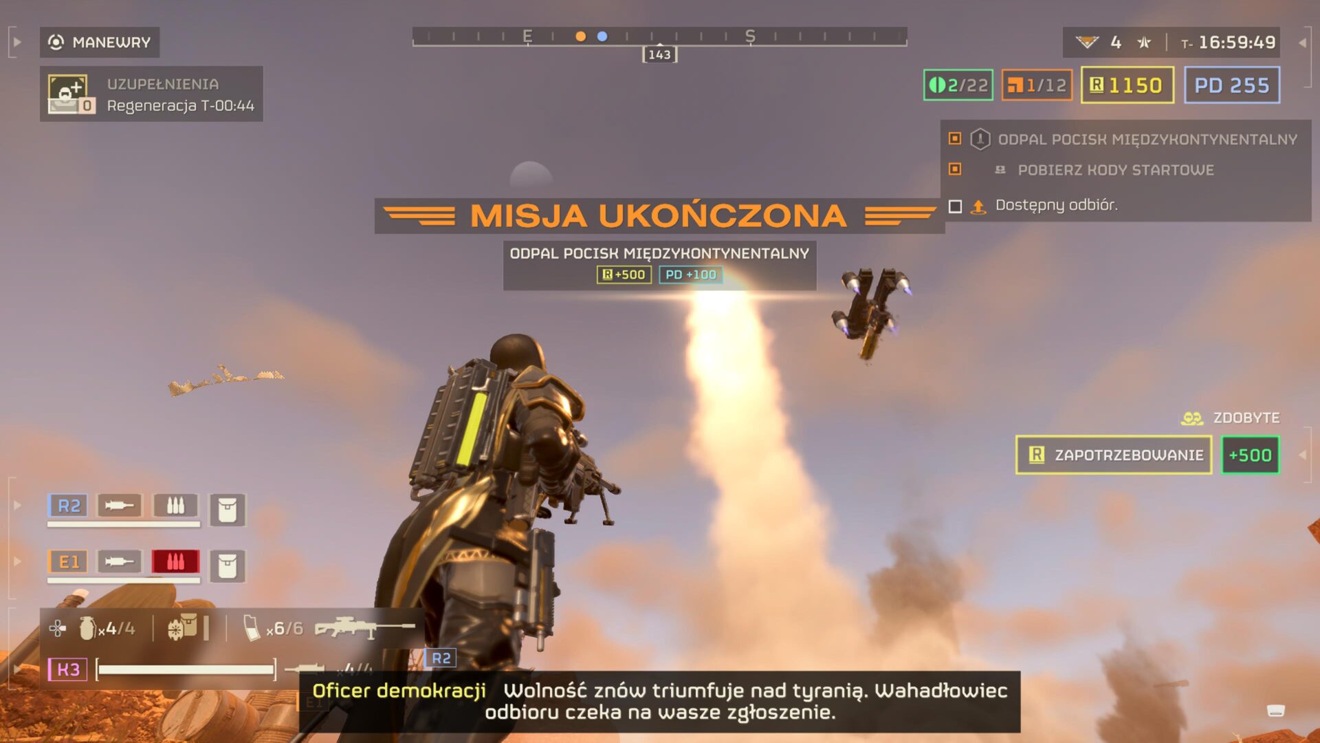 Za pomyślne wykonanie misji otrzymujemy kredyty oraz punkty doświadczenia. Te pierwsze pozwolą nam kupić nowe manewry czy zrzuty uzbrojenia, natomiast punkty XP pozwolą nam odblokowywać coraz silniejsze elementy wsparcia z naszego statku kosmicznego. Natomiast ładniejsze pancerze oraz podstawowe uzbrojenie odblokowujemy w centrum zaopatrzenia w zakładce obligacji wojennych. Przypomina to trochę karnet sezonowy. Tam walutą są medale, które otrzymujemy również za wykonanie misji oraz zadań dodatkowych.