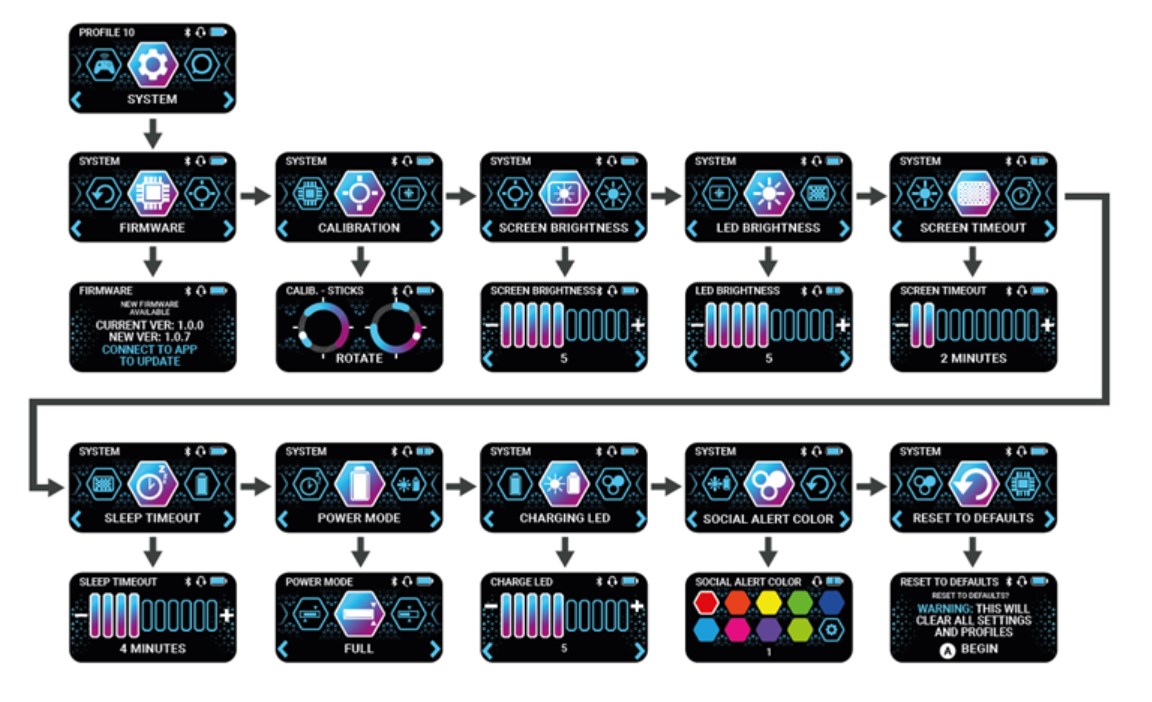 Teraz przechodzimy do menu, które z pewności doceni każdy gracz rozgrywek rankingowych. Axis mapping służy za ustawienie martwej strefy osobno dla każdego z analogów oraz triggerów. Mało tego, w tym menu możemy jeszcze ustawić responsywność analogów, do wyboru jest kilka ustawień: standard, precyzja oraz szybki. Kolejnym z dostępnych ustawień jest wybór siły silniczków wibracyjnych. Ich moc możemy ustawić w dziesięciostopniowej skali. Co bardzo ważne, w menu „system” znalazło się menu z kalibracją, zarówno dla analogów, jak i triggerów. Gdy urządzenie zacznie sprawiać, jakiekolwiek problemy, sami bez żadnego podłączania do PC możecie je skalibrować i szybko wrócić do ulubionej rozgrywki.