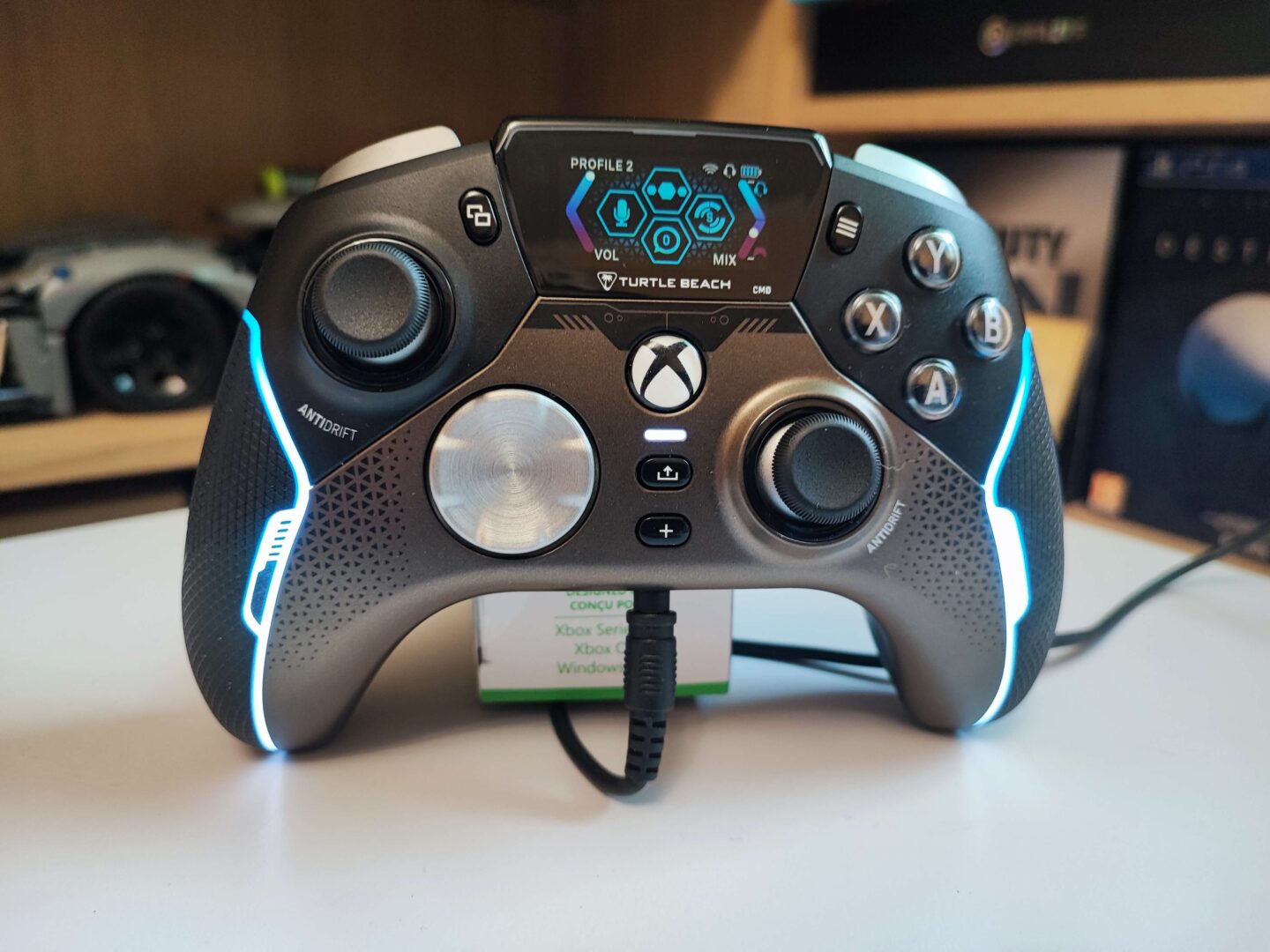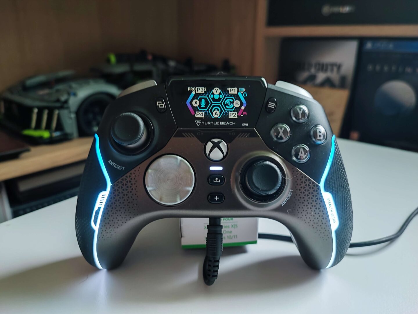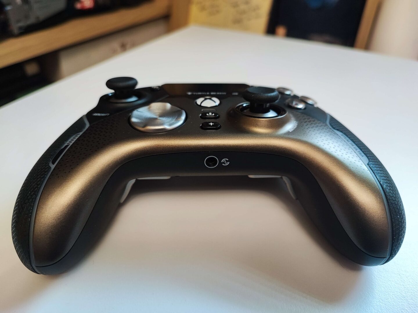Kontroler jest duży i bardzo dobrze leży w dłoniach, choć moim zdaniem za mało jest w nim gumowego pokrycia — grip jest gumowy tylko na bokach. Szkoda, że nie dano gumy jeszcze od spodu urządzenia. Za to wokół tego ogumienia ciągnie się pasek ledowy, który może świecić 16 milionami kolorów. Grzybki analogów są wklęsłe, wykonano je z gumy, do tego są większe od tych zamontowanych w standardowych padach Xbox. Natomiast bumpery i triggery pokryto dziesiątkami małych trójkącików, aby opuszki palców się na nich lepiej trzymały.