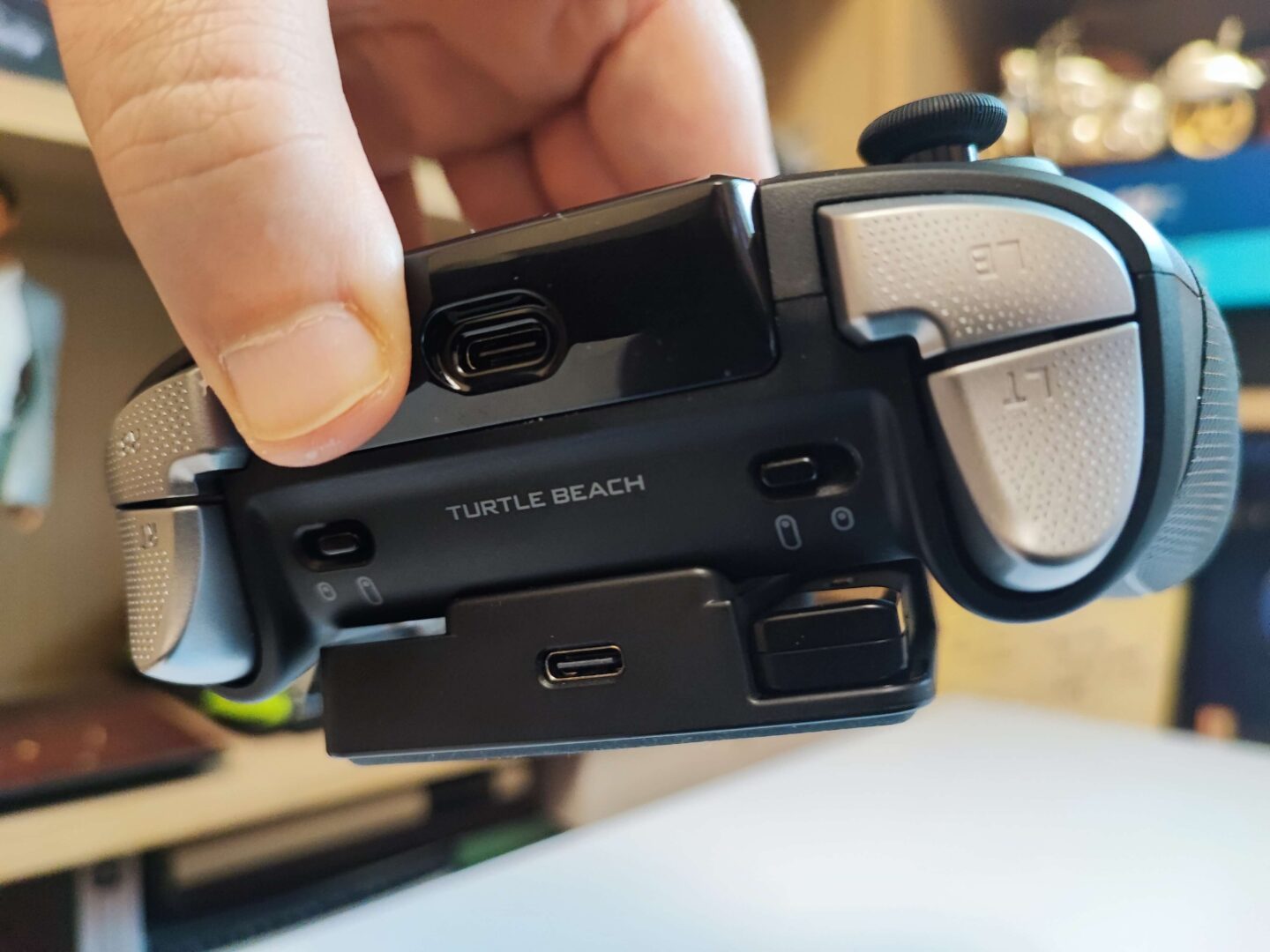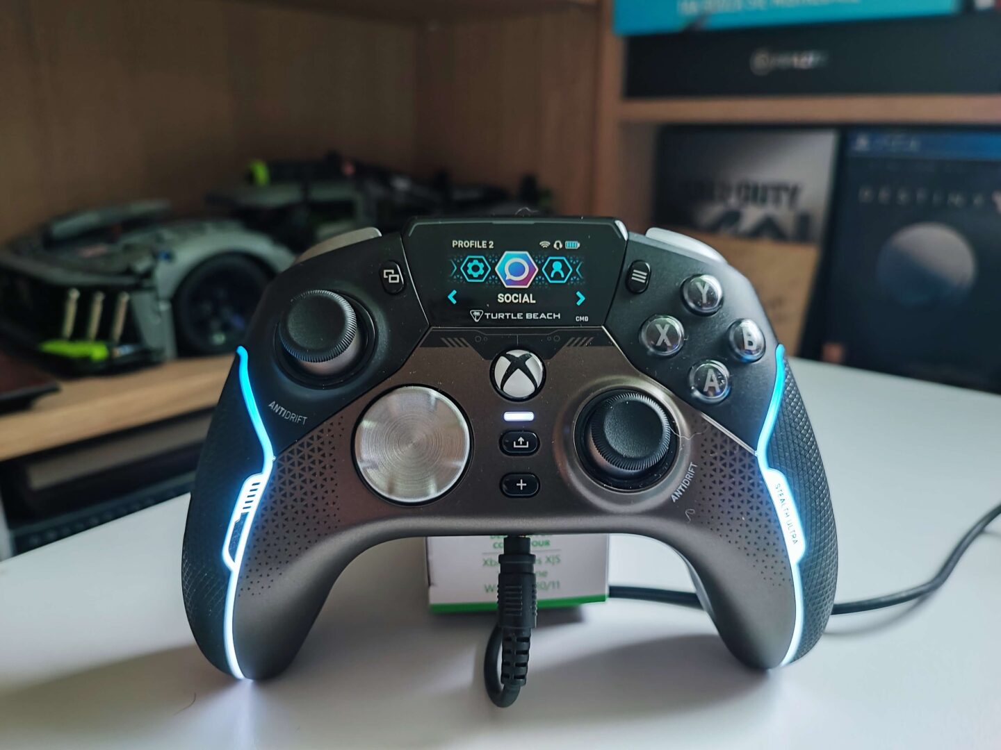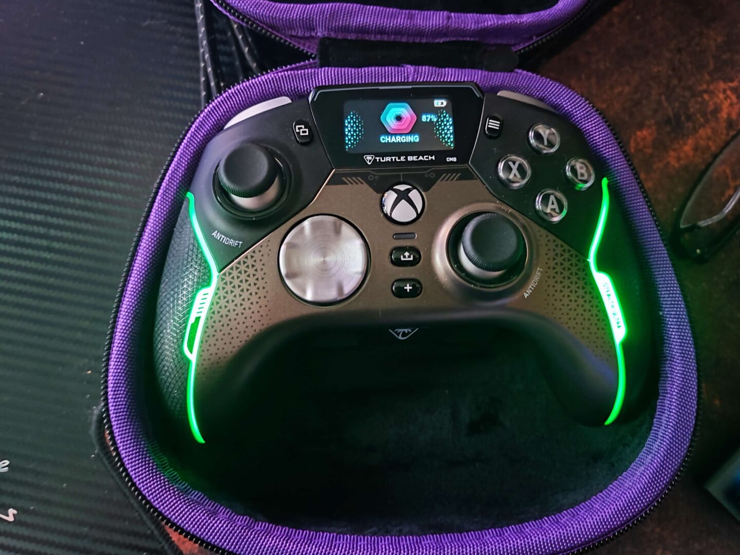 Kontroler jest duży i bardzo dobrze leży w dłoniach, choć moim zdaniem za mało jest w nim gumowego pokrycia — grip jest gumowy tylko na bokach. Szkoda, że nie dano gumy jeszcze od spodu urządzenia. Za to wokół tego ogumienia ciągnie się pasek ledowy, który może świecić 16 milionami kolorów. Grzybki analogów są wklęsłe, wykonano je z gumy, do tego są większe od tych zamontowanych w standardowych padach Xbox. Natomiast bumpery i triggery pokryto dziesiątkami małych trójkącików, aby opuszki palców się na nich lepiej trzymały.