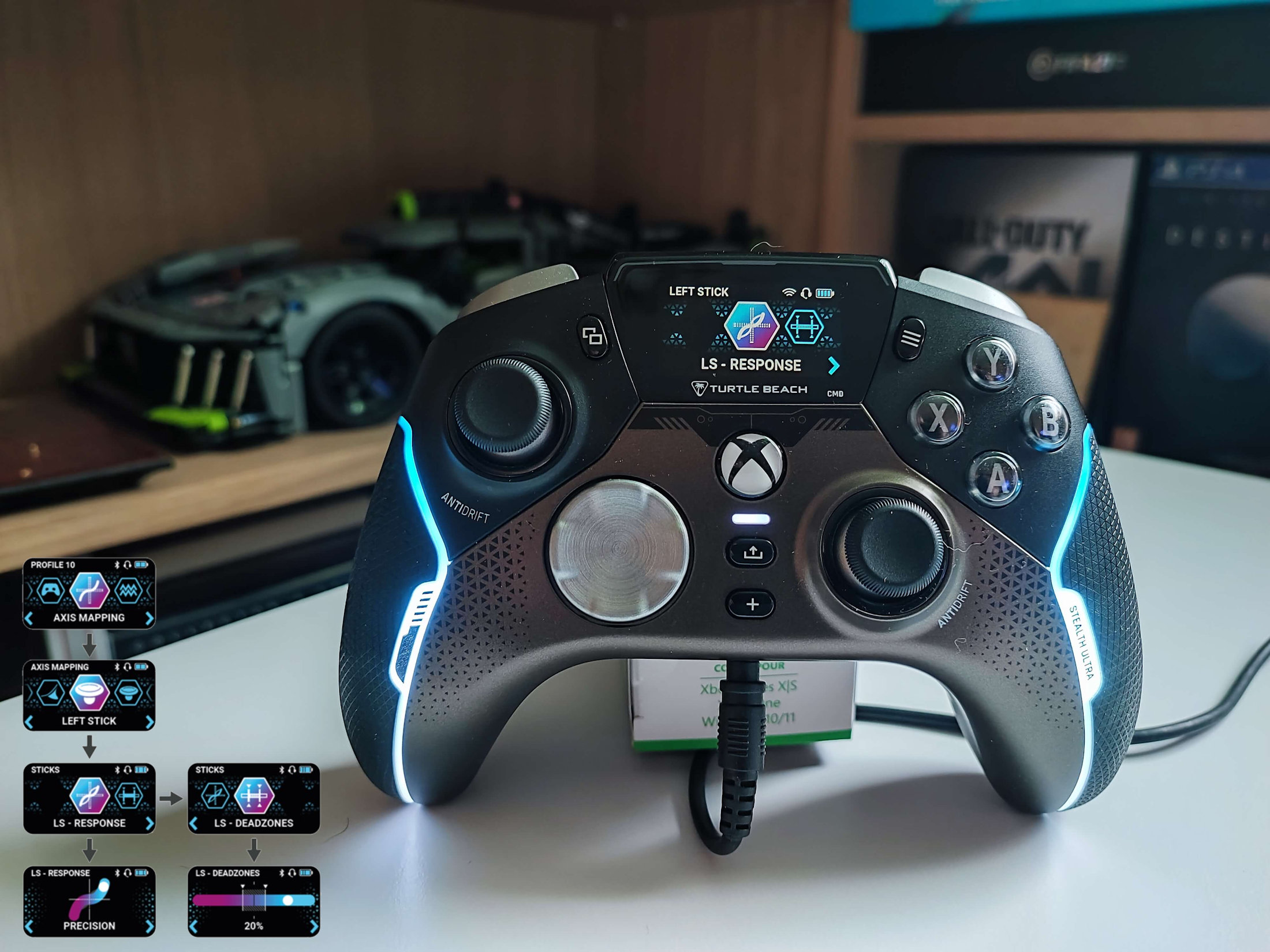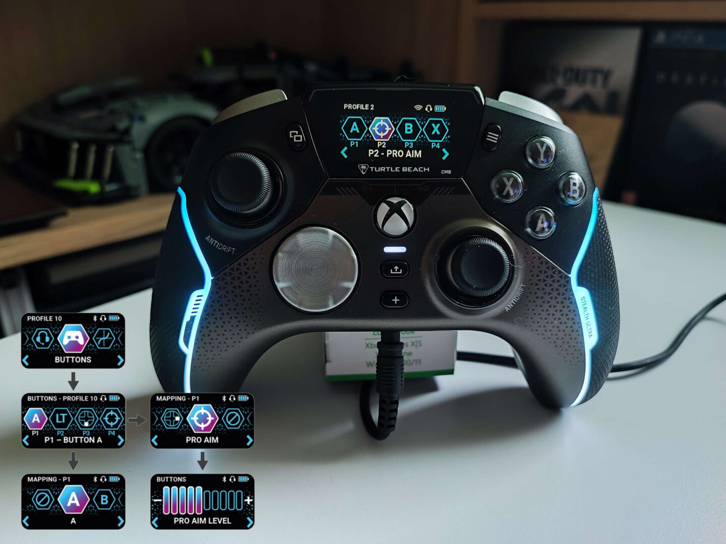 Wyobraźcie sobie, że nie musicie podłączać kontrolera do peceta bądź konsoli, aby zarządzać wszystkimi ustawieniami pada. Dzięki wbudowanemu wyświetlaczowi na ekranie kontrolera zobaczysz wszystko to, co oferuje aplikacja na PC — no, poza aktualizacją oprogramowania.