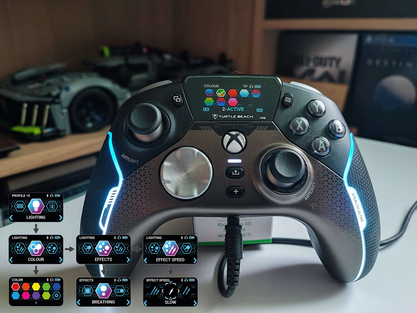 Na koniec z pewnością ucieszą się fani oświetlania LED, gdyż przyjdzie nam ustawić światełka otaczające ramiona w kontrolerze. W menu Lighting możemy ustawić ich kolor — może być to jeden lub cała paleta kolorów. Drugim ustawieniem jest efekt; może to być kolor statyczny, bicie serca, cykl kolorów, pulsujący oraz dynamiczny. Na koniec wybieramy w trzystopniowej skali szybkość, z jaką ma działać dany efekt.