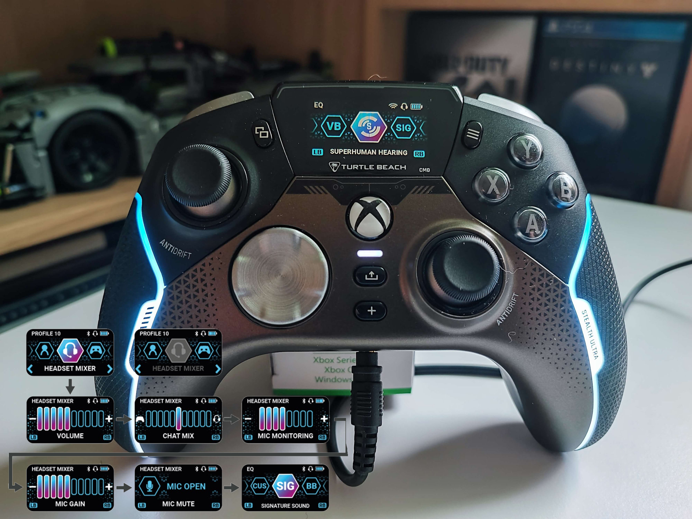 Aby wyłączyć mikrofon, naciskasz „+” oraz X; aby włączyć, robisz to samo. Natomiast naciskając „+” wraz z B, wybierasz odpowiedni kreator dźwięku. Do wyboru mamy: voice boost, superhuman hearing, signature sound oraz bass boost, bass/triple boost.