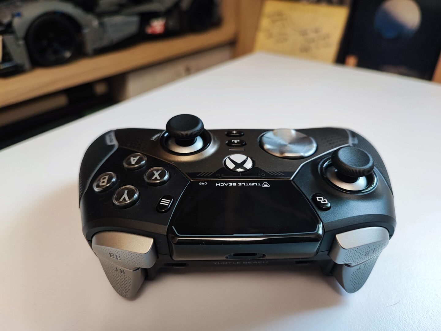 Przejdźmy teraz do tego, co z pewnością najbardziej was interesuje, czyli wyświetlacza. Ekran umieszczono w górnej części przedniej obudowy kontrolera. Wygląda to trochę tak, jakby TouchPad z DualSense’a umieszczono w padzie od Xboxa. Nie oznacza to wcale, że ekran zajmuje dużą powierzchnię. Pod nim znajdziemy Xbox Button, a na bokach umieszczono przycisk podglądu i menu. Pod Xbox Button znajdziemy przycisk od nagrywania rozgrywki i robienia zrzutów ekranu. Najniżej umieszczono przycisk ze znakiem „+” – to właśnie on uruchamia wyświetlacz i pozwala poruszać się po menu głównym kontrolera.