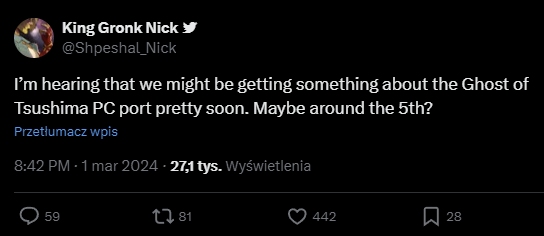 Jak wynika z wpisu zamieszczonego na platformie X przez jednego ze współzałożycieli serwisu Xbox Era, niebawem Ghost of Tsushima ma zostać oficjalnie zapowiedziane na komputery. Wspomina się o terminie około 5 marca, więc – jeśli jest to prawdziwa informacja – zaledwie dni dzielą nas od odpowiedniej zapowiedzi. Niżej możecie zapoznać się z treścią wspomnianego wpisu, który zauważył między innymi portal Insider Gaming.