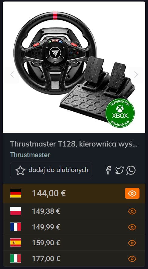 Kierownica wyścigowa Thrustmaster T128 – 144,00€ (~616 zł) – Amazon DE
