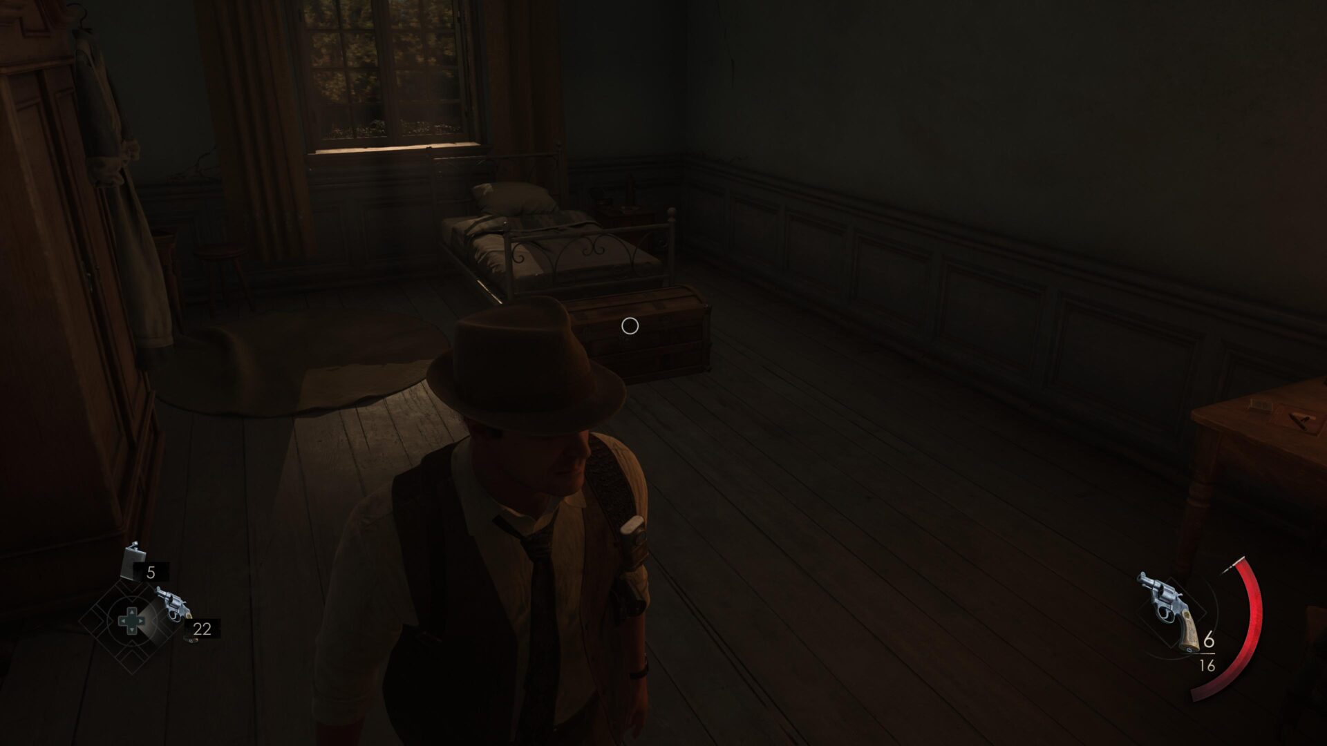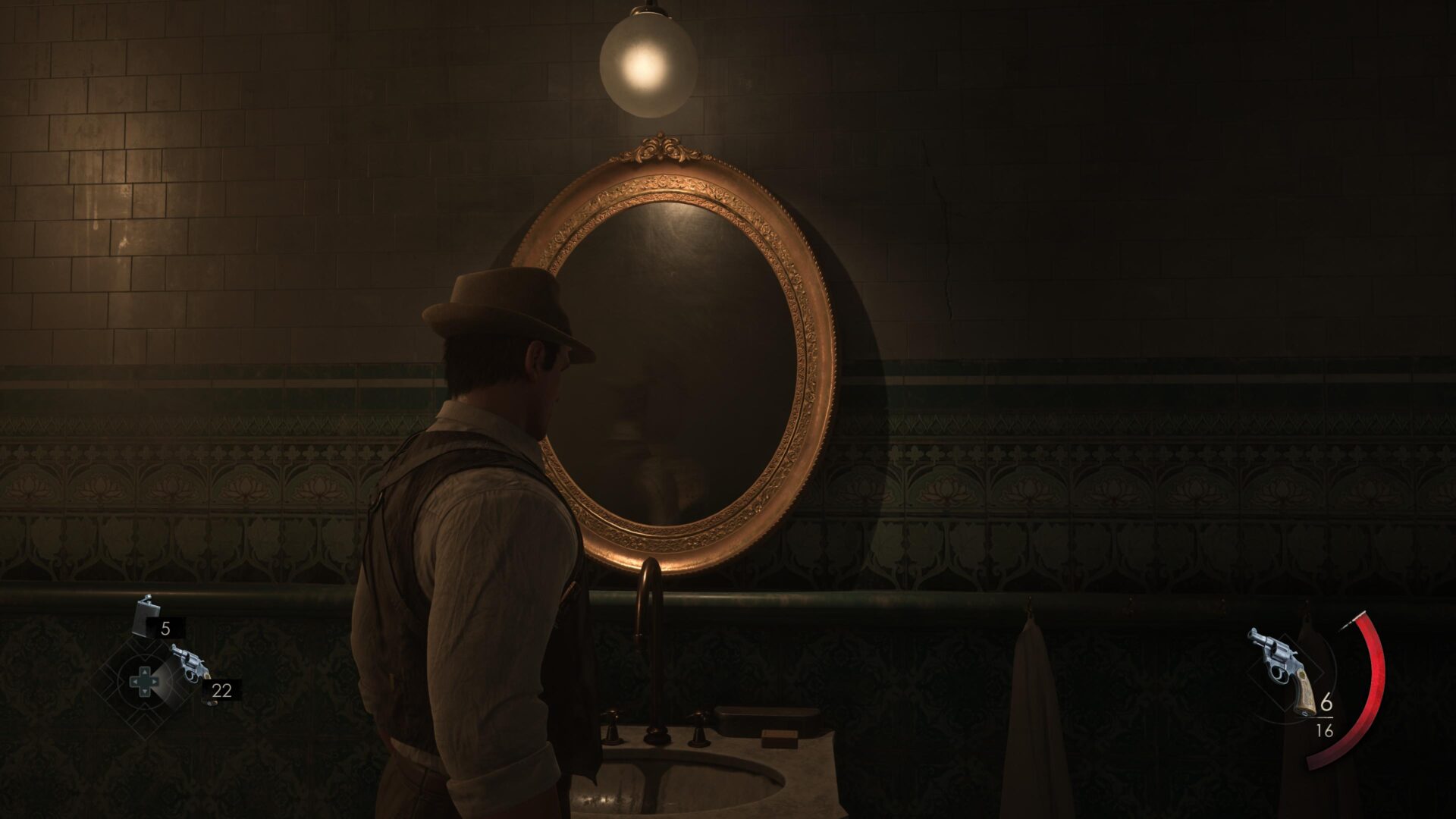 Trzeba przyznać, że Alone in the Dark stawia na immersję. Przez większość rozgrywki nie uświadczymy interfejsu — ten pojawi się, gdy będzie potrzebny. Znajdziemy tam informacje o aktualnym zadaniu, posiadanych broniach i stanie amunicji w nim, a także pasek ze zdrowiem, przy którym w większych detalach zobaczymy informacje o amunicji — nie tylk ogólną liczbę kulek, ale też ile z nich znajduje się aktualnie w magazynku.