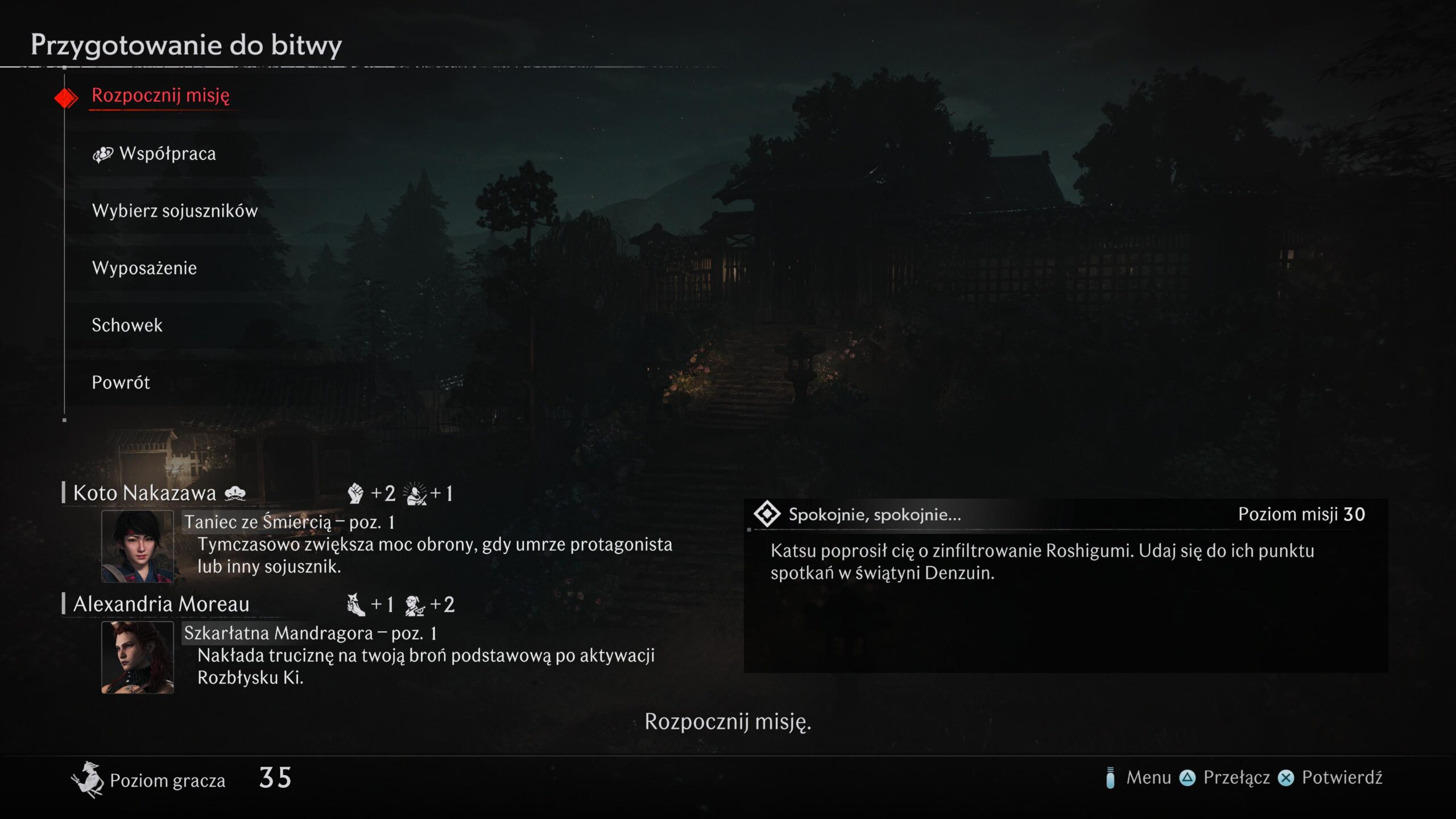 Rise of the Ronin oferuje tryb kooperacji, jednak jest on dostępny tylko w misjach fabularnych oraz sojuszniczych, które mają miejsce na określonym terenie. W swobodnej eksploracji nie mamy możliwości, aby skorzystać z sojusznika. Przed każdą misją gracz zobaczy okno z przygotowaniem do bitwy. Może tam wybrać jeden z kilku własnych zapisanych slotów na wyposażenie oraz zdecydować, czy chce grać w trybie współpracy, czy sojusznikami sterowanymi przez AI. Decydując się na tryb współpracy mamy do wyboru dwie opcje. I tak możemy zaprosić znajomych lub otworzyć rekrutację dla losowych graczy. W przypadku braku drugiego gracza możemy dobrać do składu wojownika sterowanego przez grę.